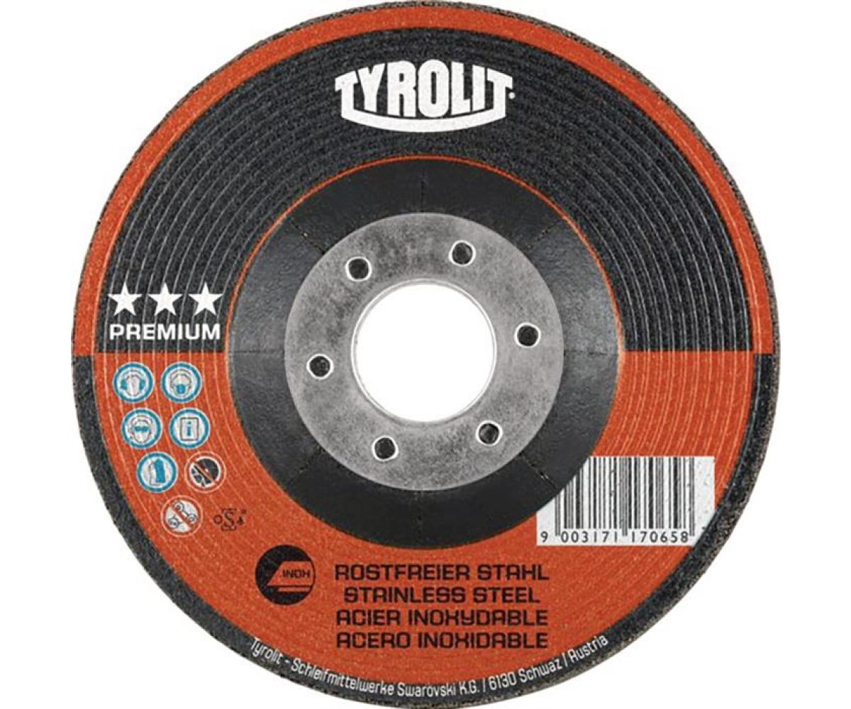 Weitere technische Eigenschaften · D x U x H: 125 x 4 x 22,23mm · Nettogewicht: 0,108kg · Produktlinie: PREMIUM · Spezifikation: A 30 R- BFX · Vs /max: 72m/s · Werkstoffeignung: Rostfreier Stahl · Schruppscheibe PREMIUM · D125xS4mmKörnung 30 · gekr.Bohr.22,23mm TYROLIT ·