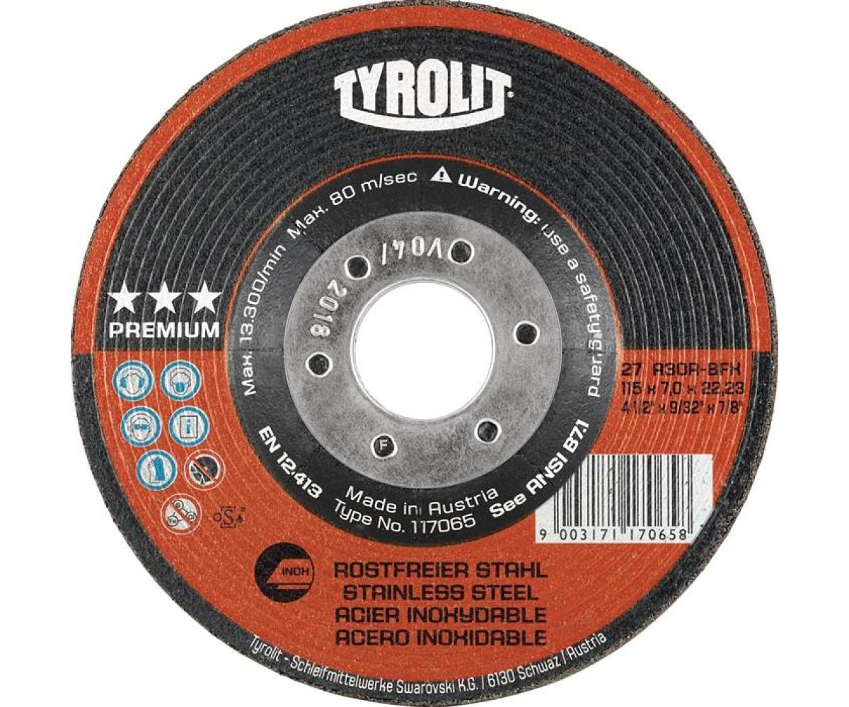 Weitere technische Eigenschaften · D x U x H: 178 x 7 x 22,23mm · Nettogewicht: 0,388kg · Produktlinie: PREMIUM · Spezifikation: A 30 R- BFX · Vs /max: 72m/s · Werkstoffeignung: Edelstahl · Werkzeug für: Winkelschleifer · Schruppscheibe PREMIUM · D178xS7mm K.30 · gekr.Bohr.22,23mm TYROLIT ·