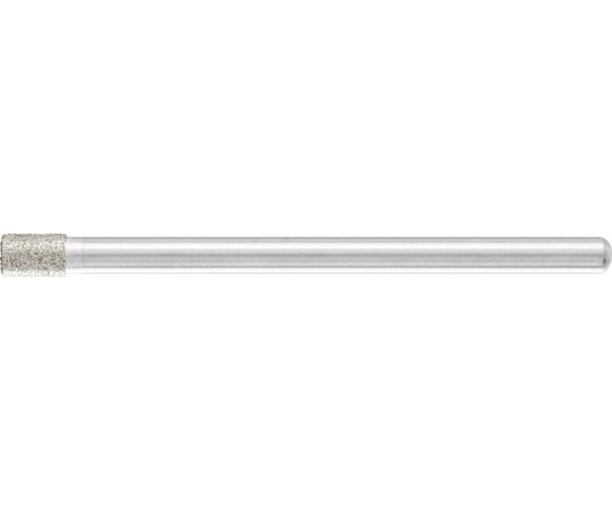 Zylinderform · galvanisch gebundenes Diamantwerkzeug zum Schleifen von Bohrungen, Radien und Konturen im stationären und im Handeinsatz · zur Bearbeitung von Hartmetall, Glas, Keramik, Porzellan, feuerfesten Werkstoffen, Ferrit, Silicium, Graphit, Gummi usw. · Schleifstifte ab einem Durchmesser von 8 mm haben eine Aussparung an der Stirnfläche