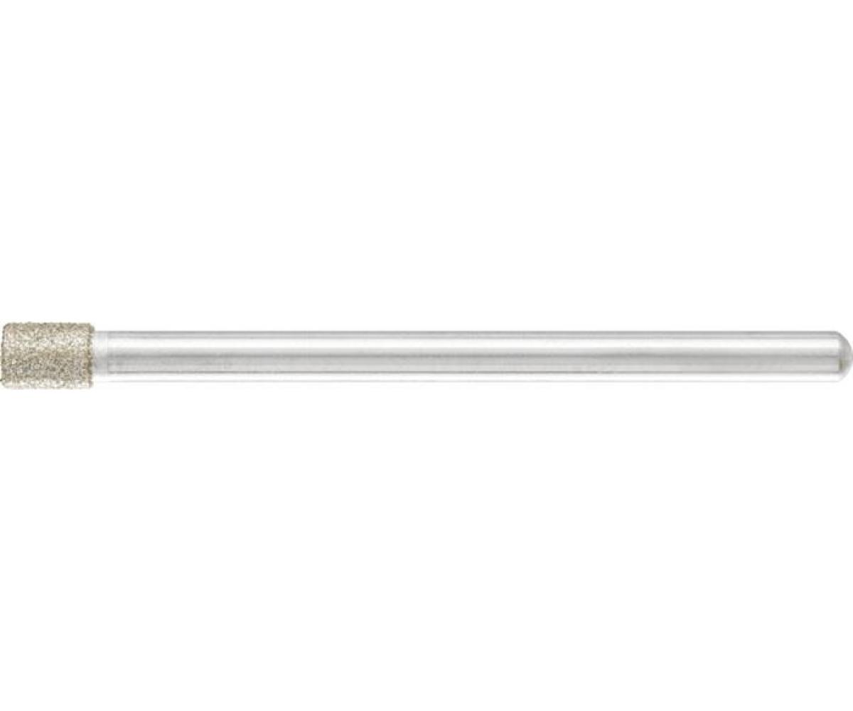Zylinderform · galvanisch gebundenes Diamantwerkzeug zum Schleifen von Bohrungen, Radien und Konturen im stationären und im Handeinsatz · zur Bearbeitung von Hartmetall, Glas, Keramik, Porzellan, feuerfesten Werkstoffen, Ferrit, Silicium, Graphit, Gummi usw. · Schleifstifte ab einem Durchmesser von 8 mm haben eine Aussparung an der Stirnfläche