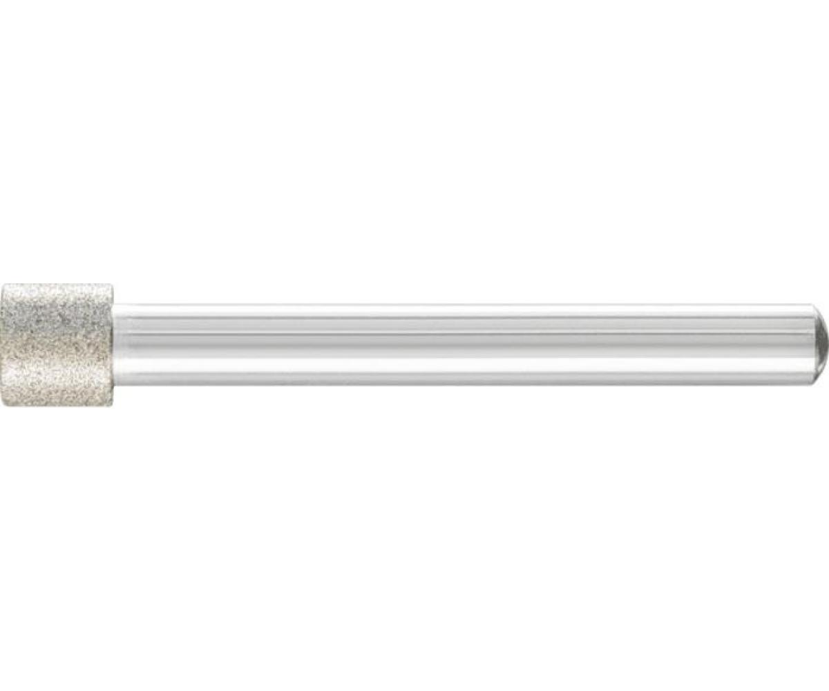 Zylinderform · galvanisch gebundenes Diamantwerkzeug zum Schleifen von Bohrungen, Radien und Konturen im stationären und im Handeinsatz · zur Bearbeitung von Hartmetall, Glas, Keramik, Porzellan, feuerfesten Werkstoffen, Ferrit, Silicium, Graphit, Gummi usw. · Schleifstifte ab einem Durchmesser von 8 mm haben eine Aussparung an der Stirnfläche