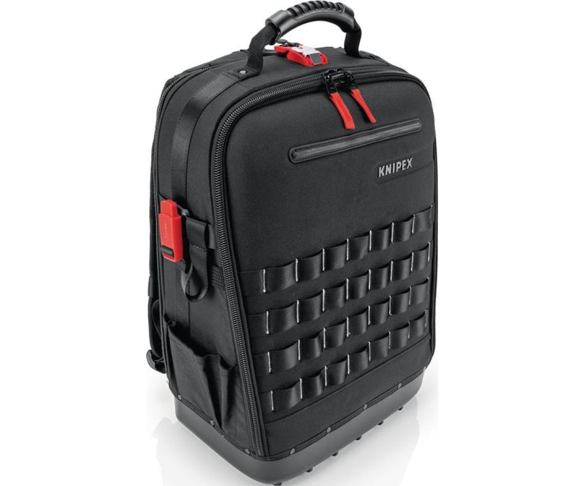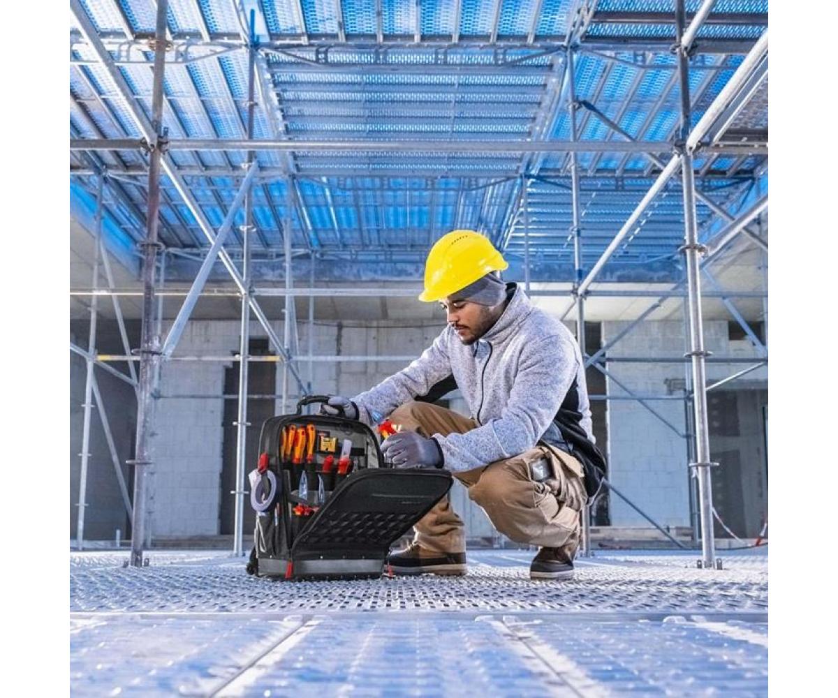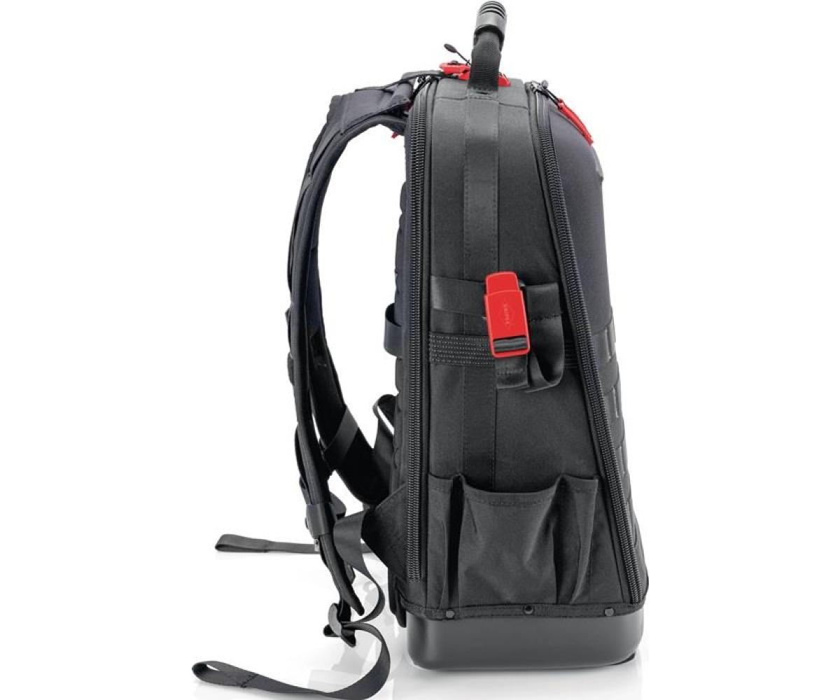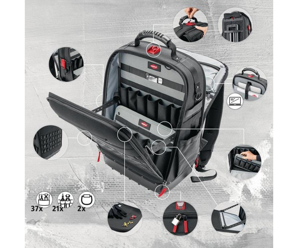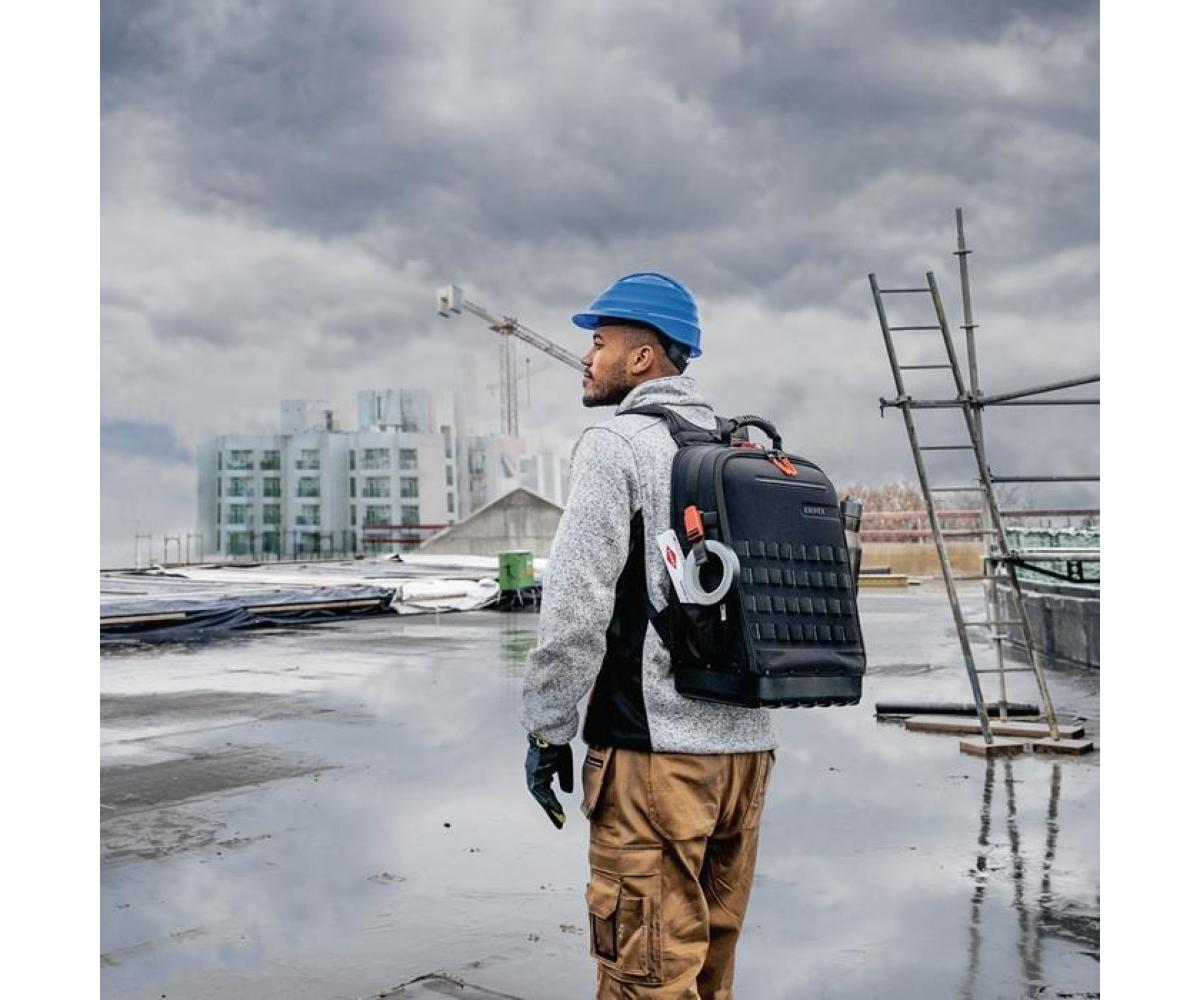 aus nachhaltigen Recycling-Kunstfasern · komplett aufklappbare Vorder- und Rückseite · herausnehmbare Werkzeugtafel und ergonomischer Rückenpolsterung · 2 separate Innenfächern für Werkzeug, Messgeräte, Notebook oder Tablet · innen 1 und außen 4 MOLLE-Bänder zur Befestigung von beliebigen Adaptern, Karabinern, Zubehör je nach Bedarf · 21 Haltelaschen und 37 Taschen, teilweise mit Reißverschlüssen · mit Kofferlasche zur Fixierung an Teleskopgriffen von Werkzeugkoffern · Leergewicht 2,9 kg · geprüfte Belastbarkeit bis 15 kg Werkzeuggewicht Besondere Produktvorteile: Widerstandsfähiges Nylongewebe, spritzwassergeschützt und leicht zu reinige. Wasserdichte Bodenschale aus schlagfestem Kunststoff für stabilen Stand im geöffneten und geschlossenen Zustand.