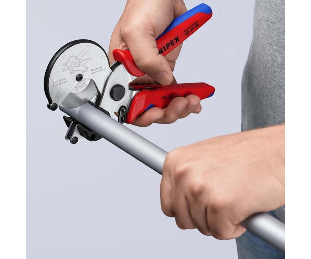 für Verbund- und Kunststoffrohre · frei drehbares Schneidrad für reibungsarmes Drehen des Rohrs · Rotationsbewegung ermöglicht müheloses Eindringen des Schneidrads bei minimierter Verformung des Rohrs · breite Kunststoff-Formauflagen für perfekt rechtwinklige Abschnitte · auch für Verbundrohre mit erhöhter Aluminiumschichtdicke (etwa Geberit Mepla) · mit Verschlussmechanismus Zange verzinkt · mit Mehrkomponenten-Hüllen