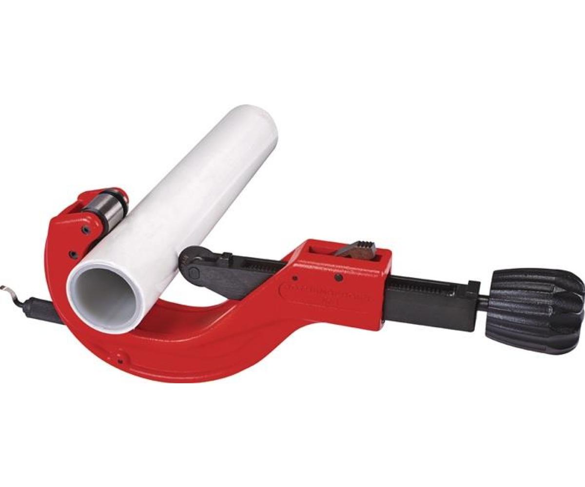 Ratschen-Teleskop-Rohrabschneider Ø 110-168 mm (4 - 6.5/8”) · zum Schneiden von PE-, PP-, PEX, PB- und PVDF-Rohren sowie schalldämmenden Abflussrohren · Stabilität durch Monoblock-Aluminiumbauweise · optimales, ermüdungsfreies Handling durch großen, ergonomisch optimierten Handgriff · Schnellverstellung auf den Rohr-Außendurchmesser durch Ratschen-Teleskopführung · schnelles Öffnen durch automatischen Rückzug · im Grundkörper versenkbarer Rohr-Innenentgrater · gehärtete Spezialschneidräder mit Spezialanschliff