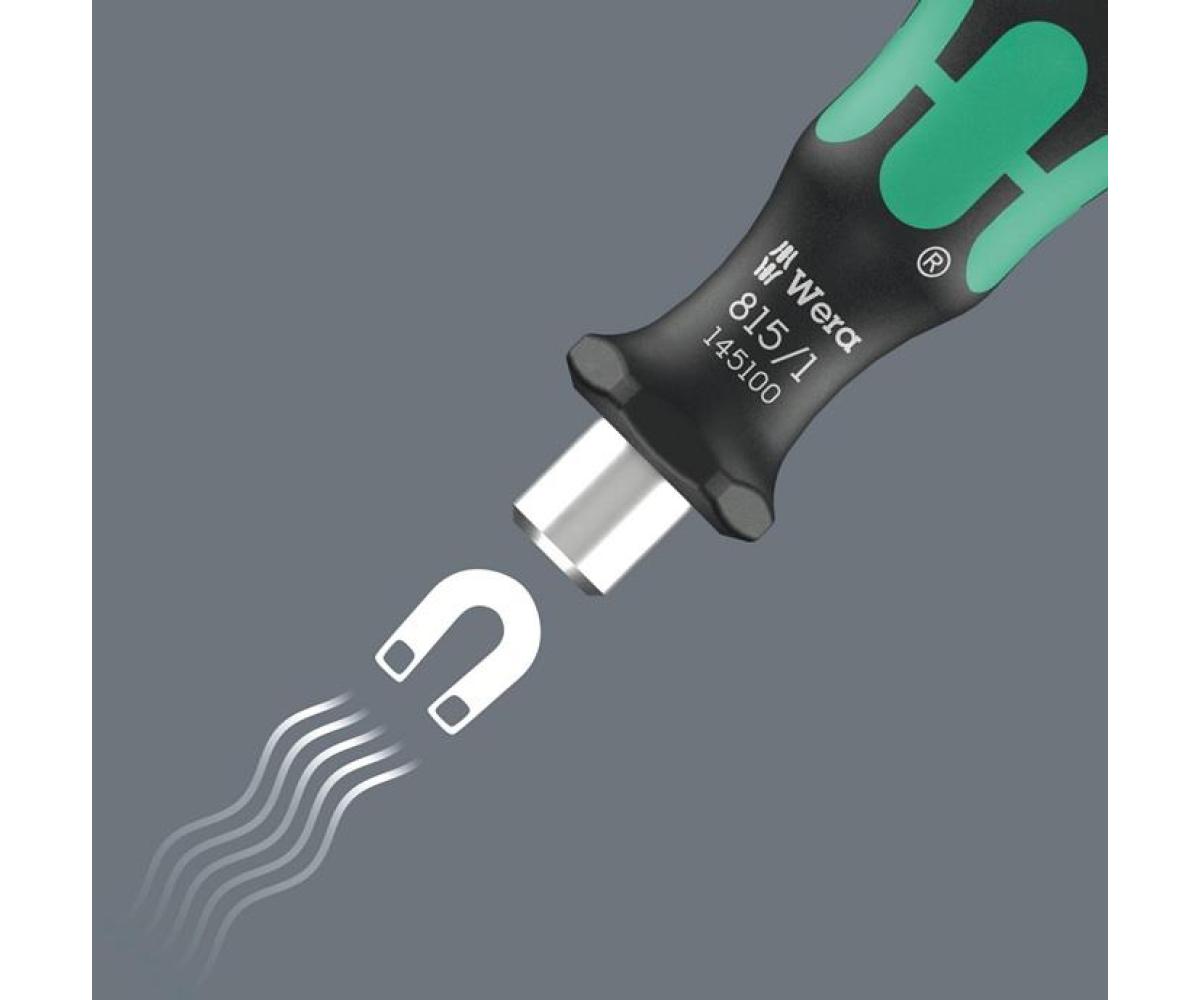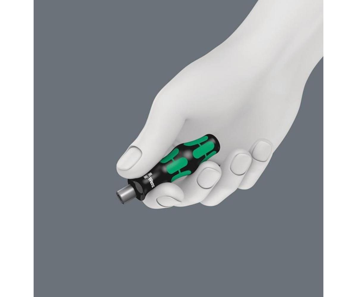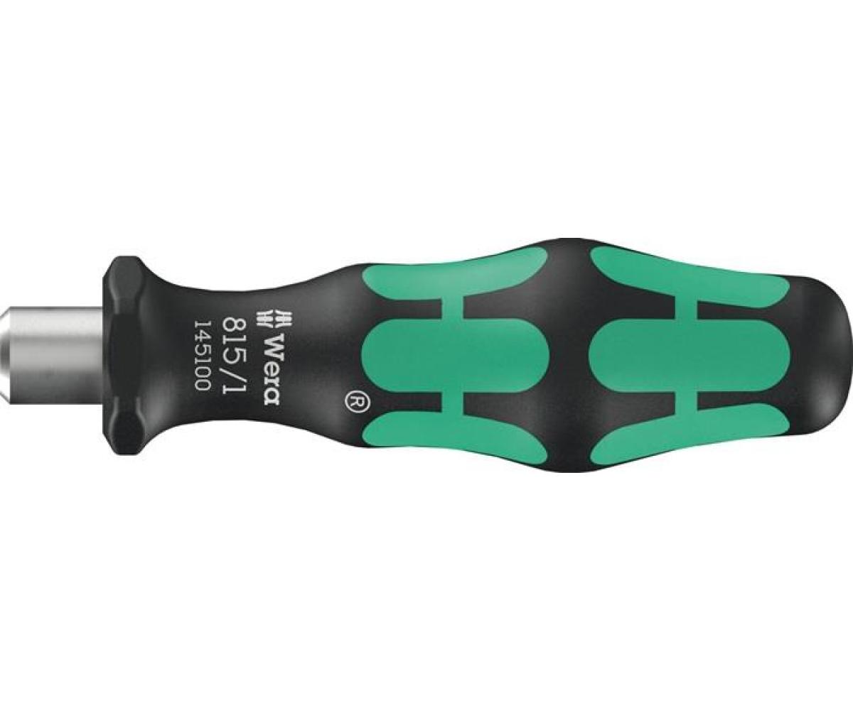 Hochwertiger Bit-Handhalter. Der Magnet sorgt für den sicheren Sitz des Bits im Halter. Kraftform Plus Griff für angenehm ergonomisches Arbeiten · bei dem Blasen und Schwielen vermieden werden. Harte Griffzonen für hohe Arbeitsgeschwindigkeit · während weiche Griffzonen hohe Drehmomentübertragung garantieren. Geeignet für Bits mit 1/4"-Außensechskantantrieb nach DIN ISO 1173-C 6,3 und E 6,3 sowie Wera Anschluss-Reihen 1 und 4.