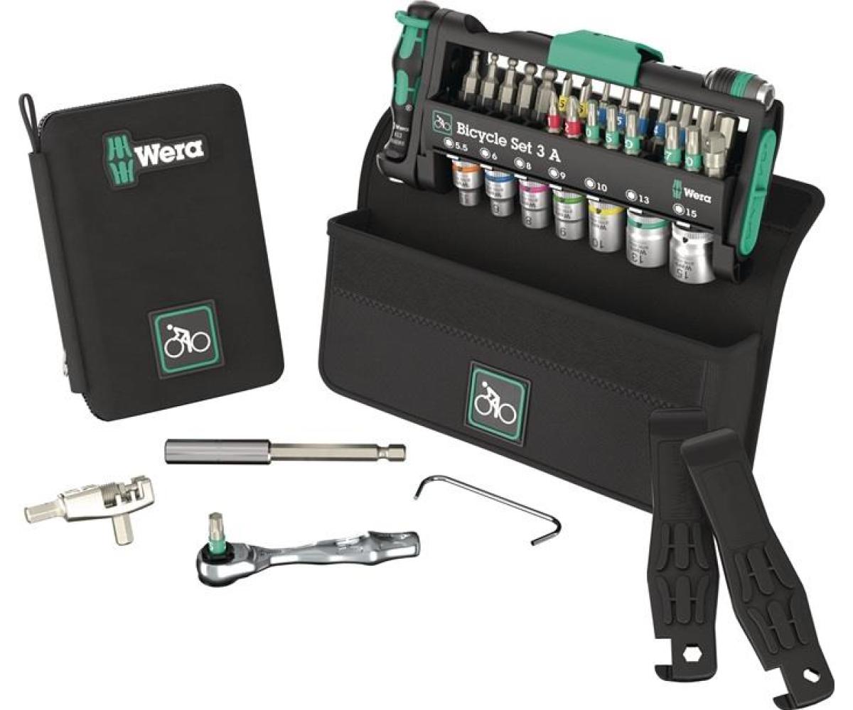 Bit-/Steckschlüsselset · Bicycle Set 3 A · 38-tlg.BZT · A · Inhalt: 1 Bit-Ratsche ¼“, 1/4“ x 87 mm 1 Bits-Handhalter, 1/4“ x 78 mm 1 Universalhalter, Edelstahl, 1/4“ x 100 mm 1 Rapidaptor Universalhalter, 1/4“ x 50 mm 1 Werkzeugschaft (Verbindungsteil), 1/4“ x 25 mm Bits: BTZ Bits für Schlitzschrauben je 1 St. 0,5 x 4 x 25 mm, 0,6 x 4,5 x 25 mm BZT Bits für Schrauben mit Kreuzschlitz (PH) 1x PH 1 x 25 mm, 1x PH 2 x 25 mm BZT TORX® Bits für Schrauben mit Innen-TORX®-Profil 1x TX 10 x 25 mm, 1x TX 15 x 25 mm, 1x TX 20 x 25 mm, 1x TX 25 x 25 mm, 1x TX 27 x 25 mm, 1x TX 30 x 25 mm BZT Bits für Schrauben mit Innensechskant-Profil je 1 St. 2,5 x 25 mm, 3 x 25 mm, 4 x 25 mm, 5 x 25 mm, 6 x 25 mm Z Bits für Schrauben mit Innensechskant-Profil je 1 St. 8 x 25 mm Z Bits für Schrauben mit Innensechskant-Profil je 1 St. 2,5 x 25 mm, 3 x 25 mm, 4 x 25 mm, 5 x 25 mm, 6 x 25 mm HMA Zyklop-Steckschlüsseleinsatz mit 1/4“-Antrieb je 1 St. 5,5 x 23 mm, 6 x 23 mm, 8 x 23 mm, 9 x 23 mm, 10 x 23 mm, 13 x 23 mm, 15 x 23 mm Reifenheber mit Bit-Aufnahme, 105 mm Reifenheber mit Ventilausdreher, 105 mm Kettennieter Kettenfixierhaken Werkzeugtasche, 203 x 85 mm Reißverschluss-Etui, 90 x 135 mm Klettstreifen 120, 120 x 50 mm ·