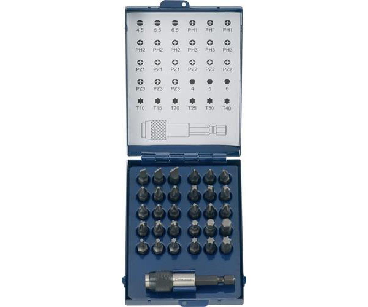 bestückt mit zähharten Bits, und Bithalter · für Hand- und Maschinenbetrieb (konv. Akkuschrauber) Inhalt: 1 Bit-Halter (Ausführung siehe Tabelle) je 1 Bit für Schlitzschrauben Gr. 4,5 / 5,5 / 6,5 mm je 3 Bits für Schrauben mit Kreuzschlitz (PH) Gr. 1 / 2 / 3 je 3 Bits für Schrauben mit Kreuzschlitz (PZD) Gr. 1 / 2 / 3 je 1 Bit für Schrauben mit Innen-TORX®-Profil Gr. T 10 / 15 / 20 / 25 / 30 / 40 je 1 Bit für Schrauben mit Innensechskant-Profil Gr. 4 / 5 / 6