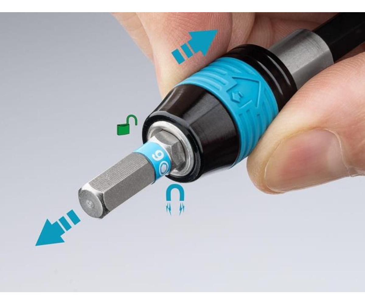 „Knarrenfunktion“ mit Freilaufmechanismus · umschaltbar rechts – links – fest · ermöglicht schnelles Arbeiten durch reibungsloses Nachfassen beim Betätigen von Verschraubungen auch in beengten Bauräumen · hervorragende Ablesbarkeit der Drehmomenteinstellung durch große, eindeutige Ziffernanzeige · kurzer 36°-Auslöseweg mit ergonomischem Auslöseverhalten und deutlich hörbarem Signal · Bithalter mit Schnellverschluss – schneller Bitwechsel mit einer Hand · Auslösemechanismus aus hochlegiertem Werkzeugstahl mit hervorragender Verschleißfestigkeit · Überschreiten des eingestellten Drehmomentes wird durch Überrastkupplung („Slipper“) ausgeschlossen · leicht erkennbarer Verriegelungszustand mittels Schloss-Symbolen · mit Kalibrierschein und Seriennummer · Kalibrier- und Reparierfähigkeit im Remscheider HAZET Service-Center · ergonomischer HAZET 2-Komponenten-T-Griff · geprüft nach DIN EN ISO 6789-2:2017 · Abtrieb: 1/4 Zoll (6,3 mm) · Sechskant hohl · für Handbetätigung · Genauigkeit: 6%