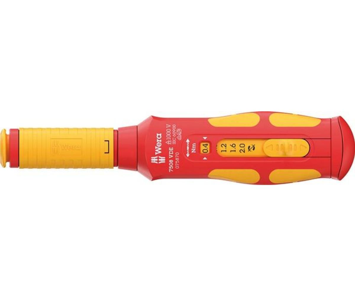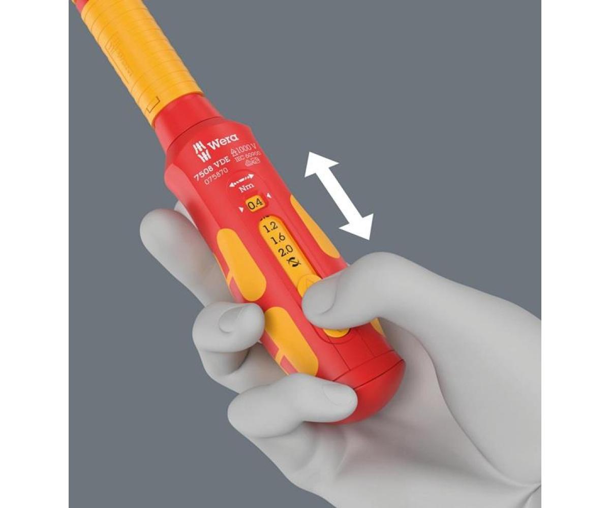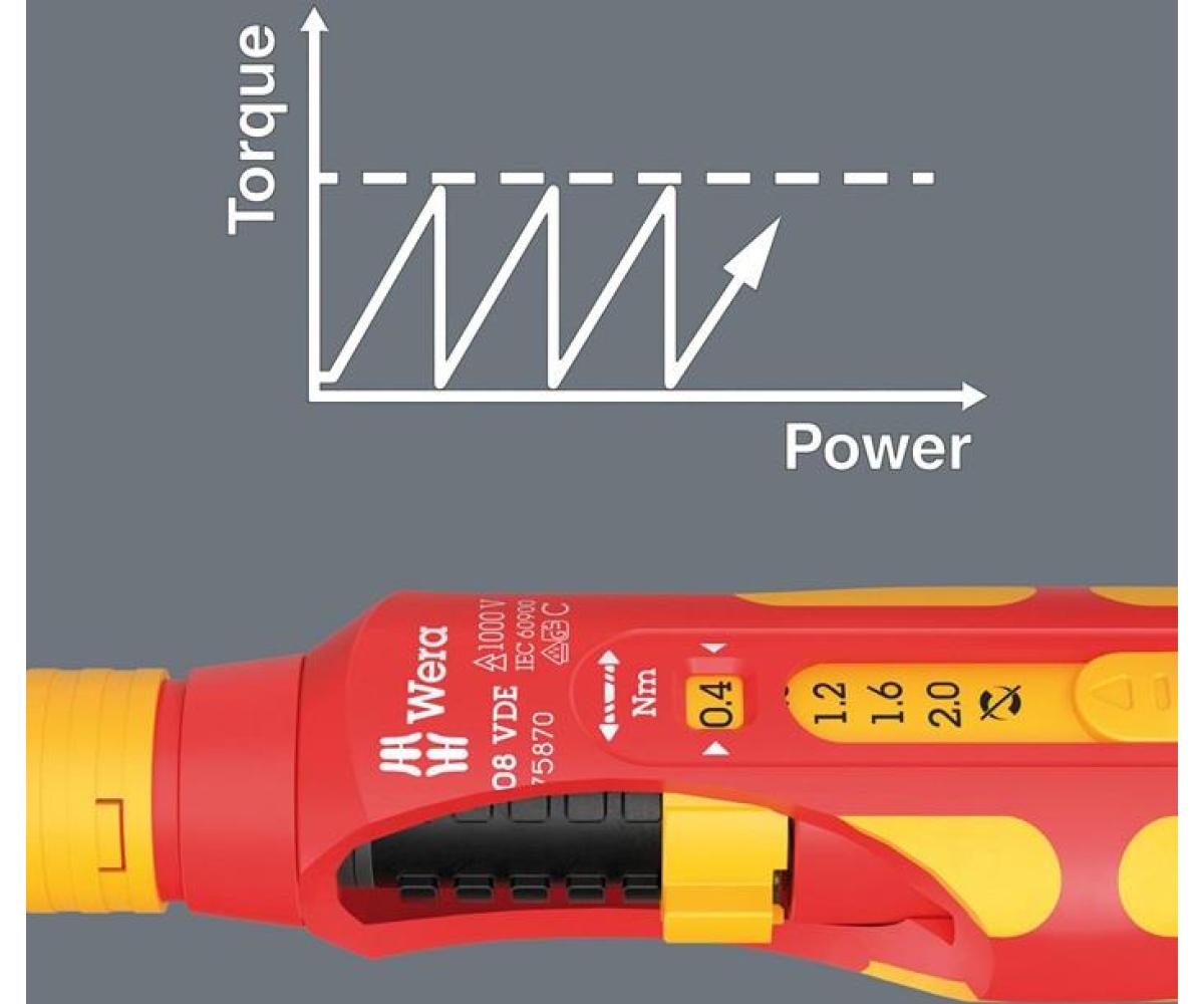 VDE-isolierter Drehmomentschraubendrehergriff mit 9 mm Sechskantaufnahme · ausschließlich für Wera Kraftform Kompakt VDE Wechselklingen · für professionelles Schrauben/Feinjustage UND für drehmomentkontrolliertes Schrauben · Überrutschende, nicht überziehbare Drehmomentfunktion für Rechts-/ Linksanzug · mit fünf wählbaren Anzugsdrehmomenten Rechts/Links (Art.-Nr. 8004 994 758: 0,4 · 0,8 · 1,2 · 1,6 · 2,0 Nm bzw. Art.-Nr. 8004 994 759: 2,4 · 2,8 · 3,2 · 3,6 · 4,0 Nm), die extrem schnell eingestellt werden können · eine Fest-Stellung (Torque Lock) für unbegrenzte Löse-/Anzugsmomente · mit Freilaufhülse für eine gute Führung des Werkzeugs während des Schraubvorgangs