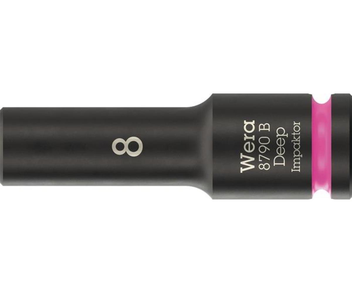 Weitere technische Eigenschaften · Außenmaß (d1): 14,1mm · Durchmesser hinten (d2): 19,0mm · Icon links: Außensechskant · Icon rechts: Aussenvierkant · Schlagschrauberfest: ja · Take it easy Nuss: ja · Steckschlüsseleinsatz · 8790 B Impaktor Deep 3/8 · Zoll 8mm L.63mm WERA ·