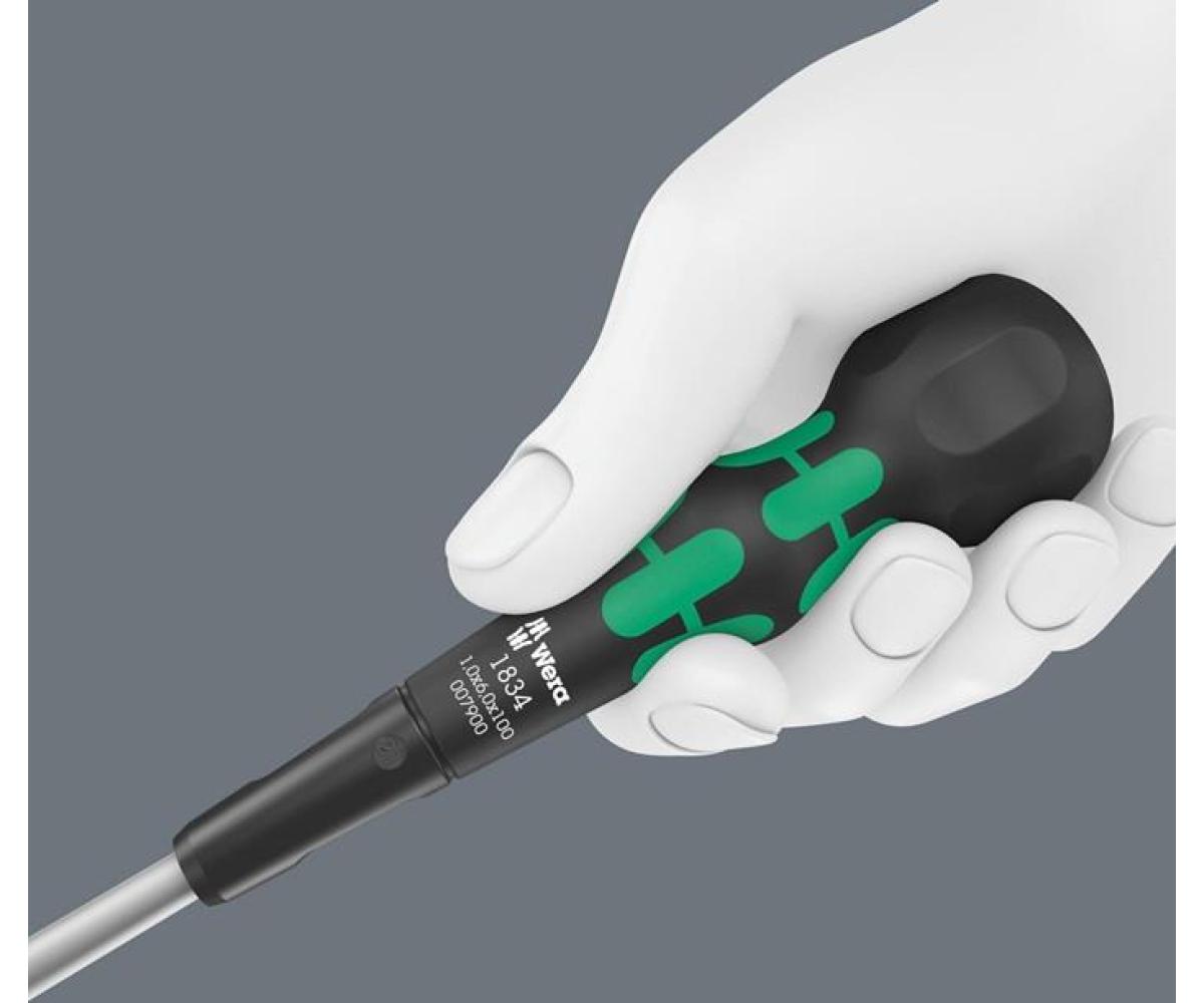 Weitere technische Eigenschaften · Klingen-Ø: 6mm · Schneidenstärke: 1mm · Abrollschutz: ja · Gesamtlänge Klinge: 150mm · Gesamtlänge Klinge in Zoll: 6"Zoll · Grifflänge: 135mm · Klingenbreite (in Zoll): 1/4"Zoll · Klingenlänge (in Zoll): 4 23/32"Zoll · Kraftform Griff: ja · Lasertip: ja · Take it Easy Kraftform Schraubendreher: ja · Schraubendreher 1834 6mm · Klingen-L.120mm WERA ·