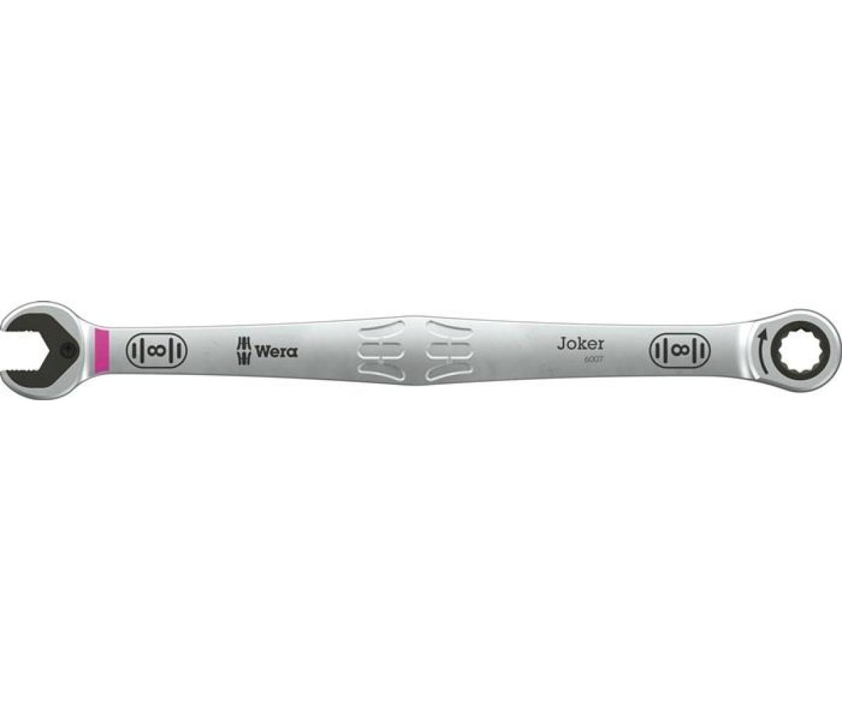 Weitere technische Eigenschaften · Anti-Slip: ja · Außenmaß (b) Maul: 21mm · Außenmaß (b1) - Ratschenringschlüssel: 18mm · Endanschlag: ja · Extra long Joker: ja · Farbe: leuchtpink · Haltefunktion: ja · High Torque Ratchet Wrench: ja · Kopfdicke: 6mm · Rückholwinkel: ja · Take it easy Maul-Ringratschen-Schlüssel Joker: ja · Max. Kopfhöhe - Ratschenringschlüssel: 7mm · Maulringratschenschlüssel · 6007 Joker SW 8mm L.180mm · WERA ·