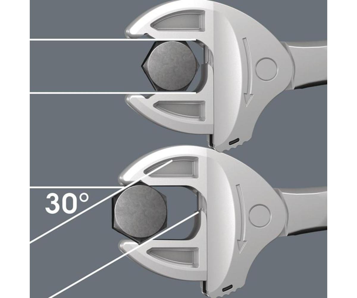 selbstjustierender Doppelmaulschlüssel mit Ratschenfunktion · größenverstellbare Maulseiten · parallel geführte glatte Backen · mit 30° Rückschwenkwinkel über die Eckweitenprismen im Maul