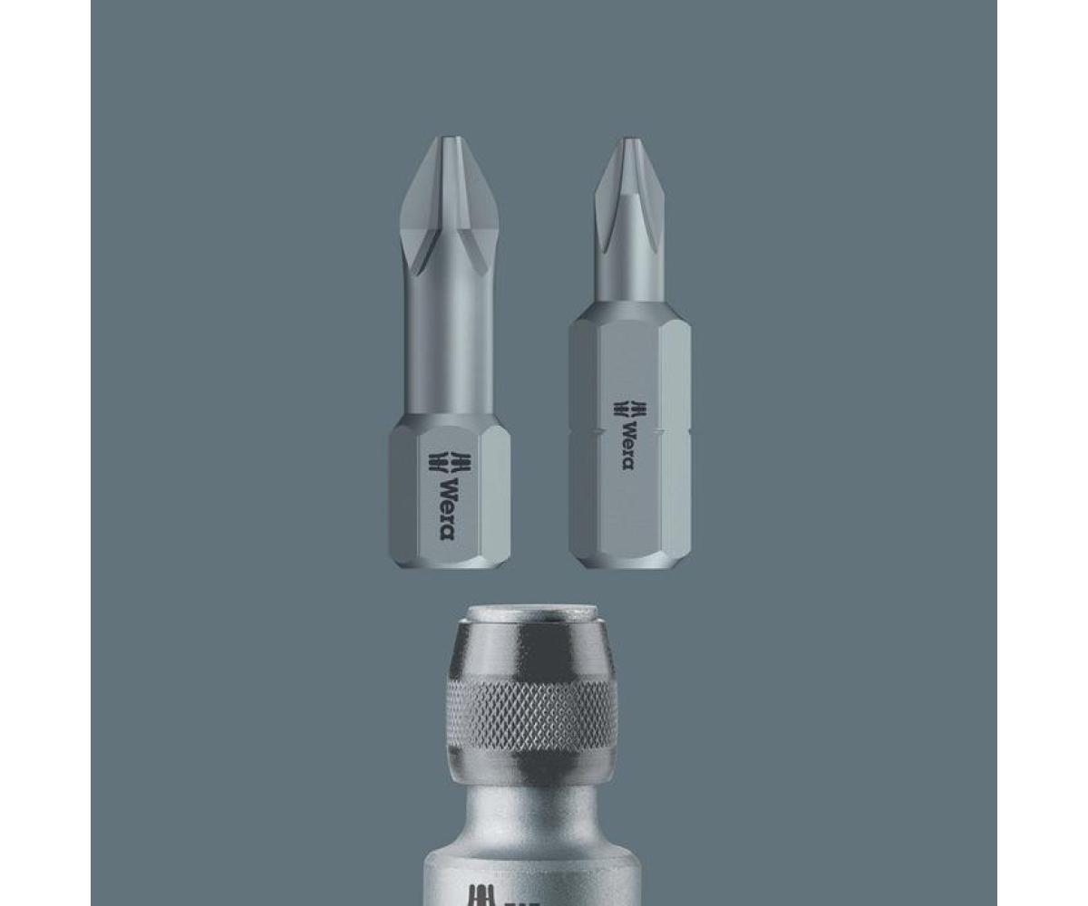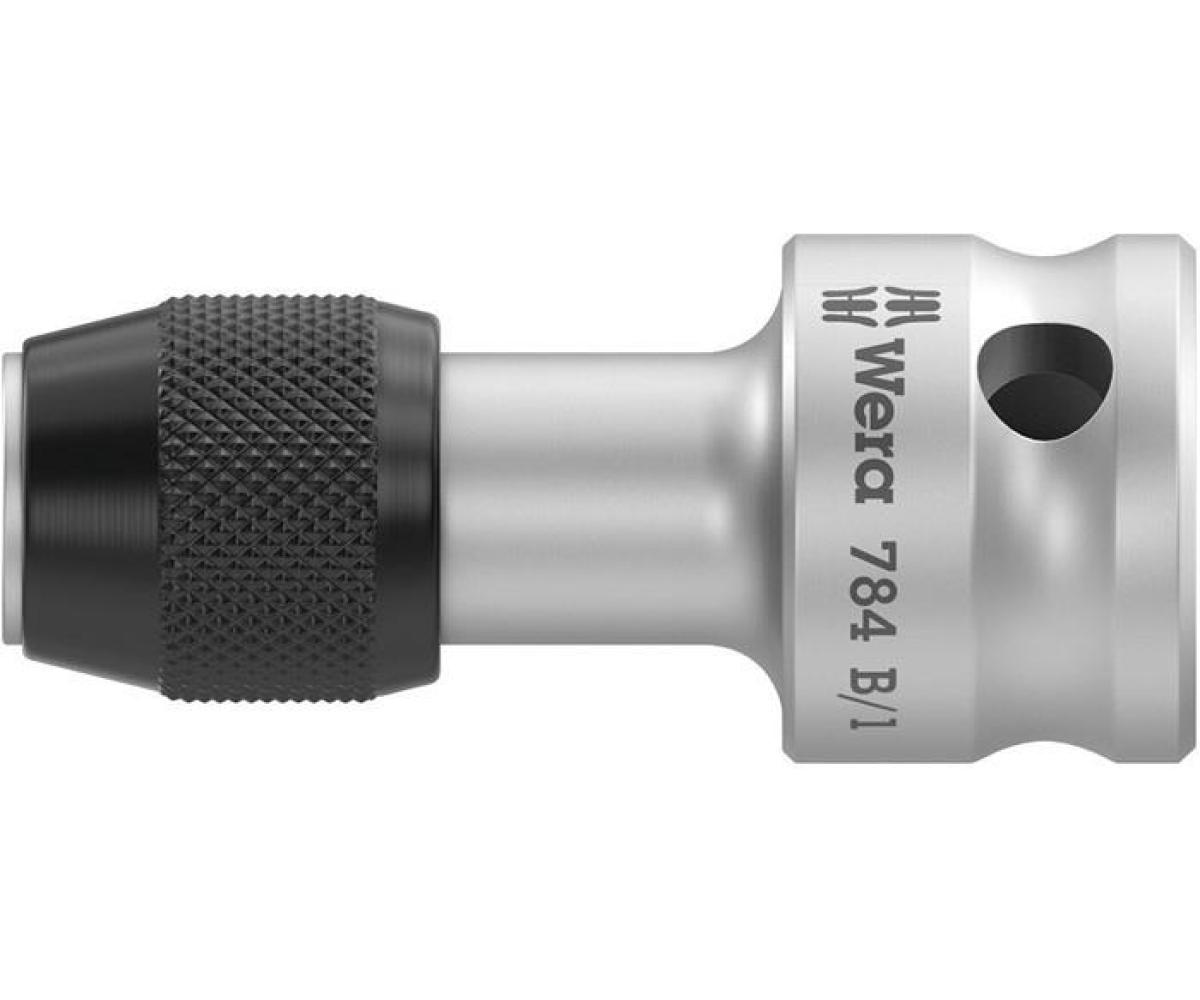 Verbindungsteil von Vierkant auf Sechskant. Mit Schnellwechselfutter für schnellen Bit-Wechsel. Geeignet für die Aufnahme von Bits mit 1/4"-Außensechskantantrieb nach DIN ISO 1173-C 6,3. Antrieb: 3/8"-Innenvierkant.