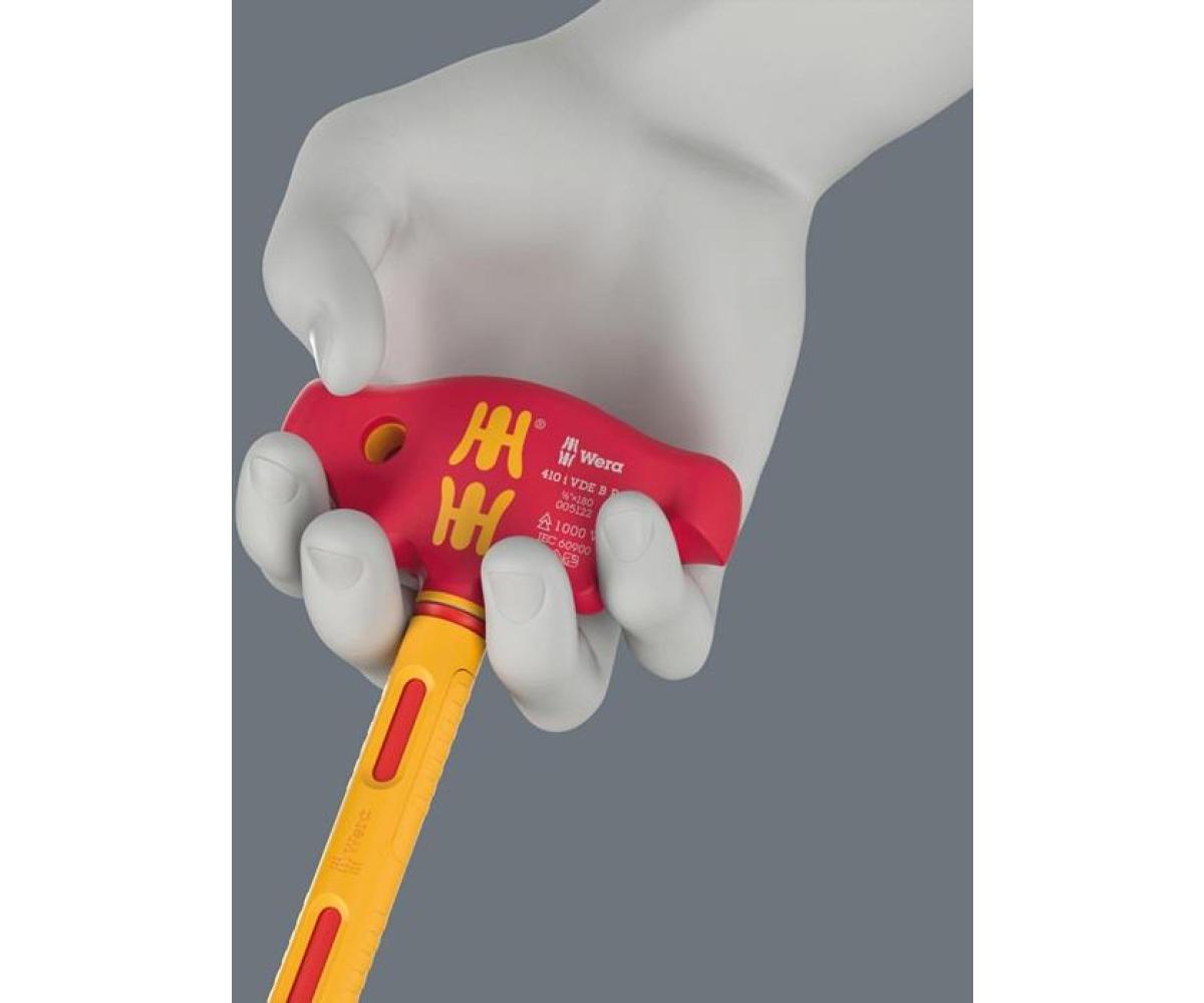 Weitere technische Eigenschaften · Griffdurchmesser: 99mm · Grifflänge: 49mm · GS - Geprüfte Sicherheit: ja · Icon links: Innenvierkant · Klingenlänge: 130mm · Klingenlänge (in Zoll): 5 1/8"Zoll · Rückholwinkel: 4,5Grad · Schnelldrehhülse VDE Quergriff: ja · Steckschlüsseleinsatz 410 · i VDE B RA 3/8 Zoll WERA ·