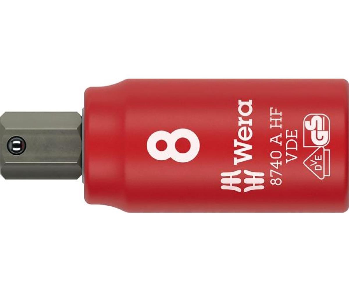 Weitere technische Eigenschaften · Durchmesser hinten (d2): 18,0mm · Hex-Plus: ja · Höhe Abtrieb: 11,0mm · Icon links: Innensechskant · Icon rechts: Aussenvierkant · Mit Haltefunktion für Innensechskant-Schrauben: ja · Steckschlüsseleinsatz · 8740 A VDE HF 1/4 Zoll SW · 8mm L.47mm WERA ·