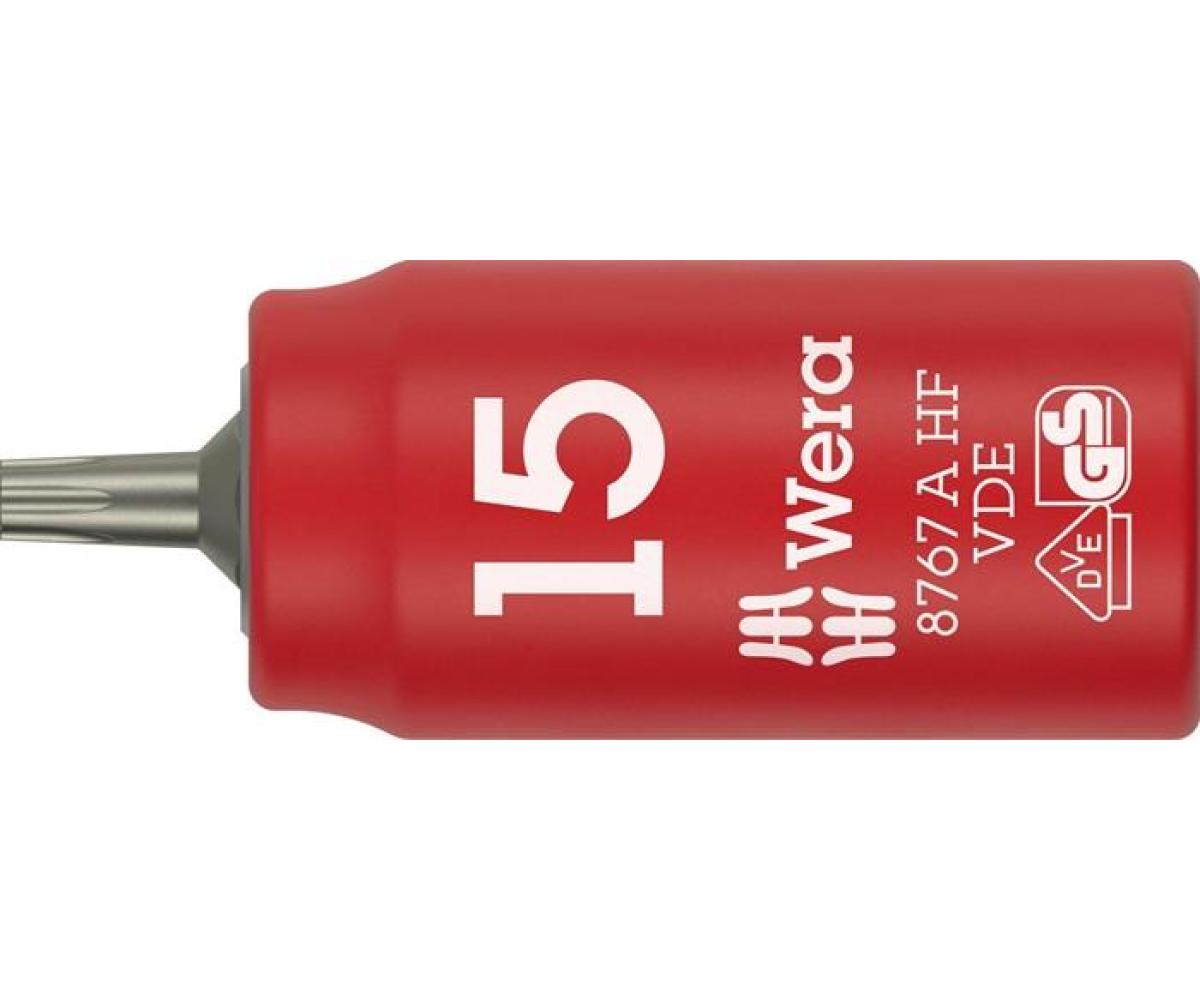 Weitere technische Eigenschaften · Durchmesser hinten (d2): 18,0mm · Höhe Abtrieb: 9,0mm · Icon links: TORX® · Icon rechts: Aussenvierkant · Mit Haltefunktion für Innen-TORX®-Schrauben: ja · Steckschlüsseleinsatz · 8767 A VDE HF 1/4 Zoll TX · 15 L.36mm WERA ·