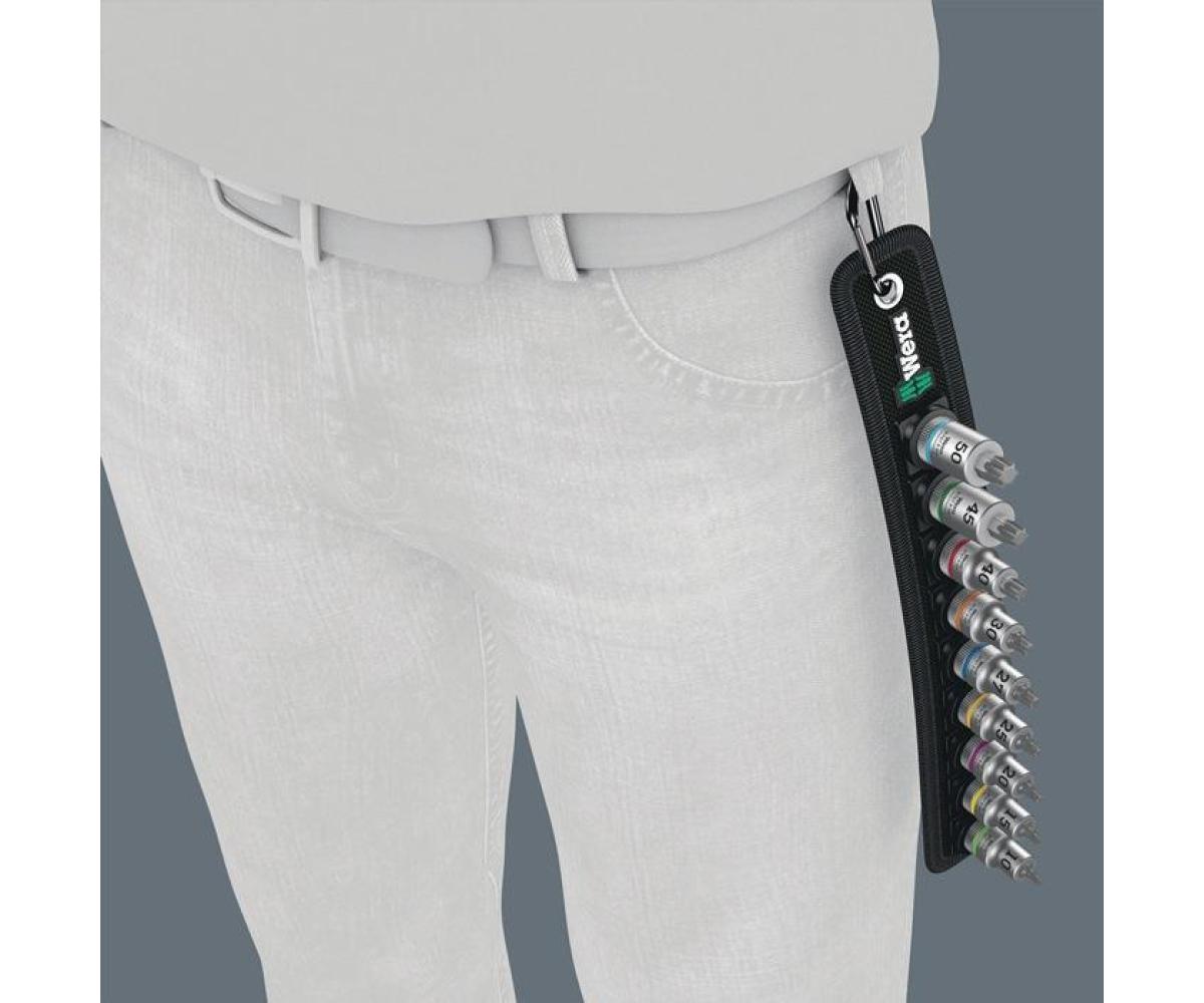 robuster Textilgurt (Belt) im typischen Wera Design mit 9 Bitnüssen auf engstem Raum · leichtgängiger Drehmechanismus sorgt für einen sicheren Halt und leichte Entnahme der Nüsse · mit "Take it easy" Werkzeugfinder mit Farbkennzeichnung nach Größen - zum einfachen und schnellen Finden des benötigten Werkzeugs · inklusive Karabinerhaken zur Befestigung an Gürtelschlaufen oder Taschen · besonders kurze, stabile Bit-Nüsse mit den Vorzügen der Wera Bit-Technologie · Bitnüsse mit Haltefunktion für besonders komfortables Schrauben und reduzierter Gefahr des Schraubenverlustes beim Zuführen zum Werkstück · mit Vliesrücken und Klettklebestreifen zur einfachen Befestigung z.B. an Wand, Regal, Werkstattwagen und Wera 2go Werkzeugtransportsystem
