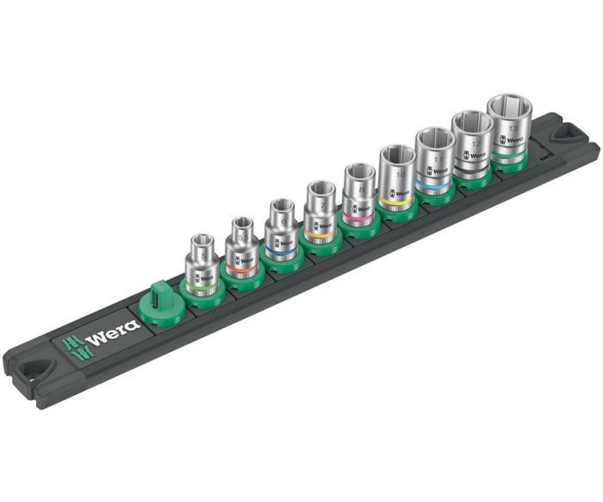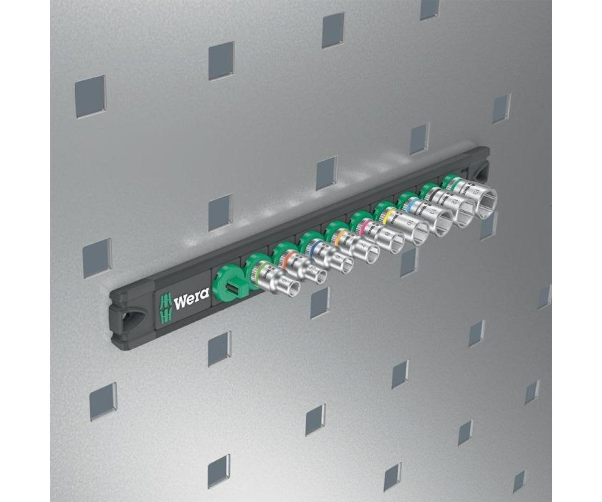 Nuss-Magnetleiste mit 9 Hand- und Maschinensteckschlüssel-Einsätzen (non-impact) · 1/4". Ein leichtgängiger Drehmechanismus sorgt für einen sicheren Halt und leichte Entnahme der Nüsse. Mit Take it easy Werkzeugfinder mit Farbkennzeichnung nach Größen - zum einfachen und schnellen Finden des benötigten Werkzeugs. Die Magnetleiste ermöglicht die temporäre Anbringung an metallischen Oberflächen und verfügt dank der Twist to unlock Funktion über eine sichere Nussverriegelung und -entriegelung.