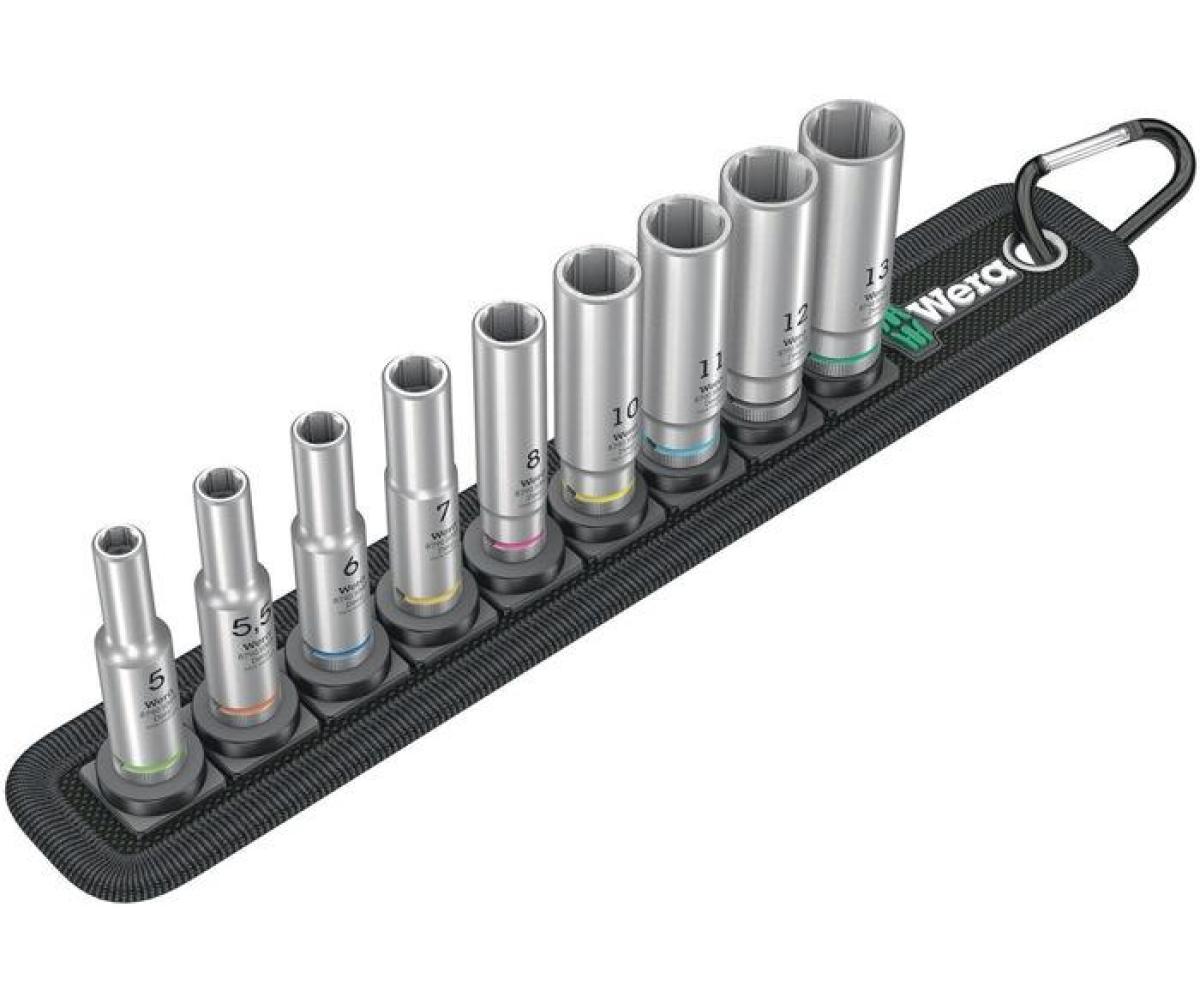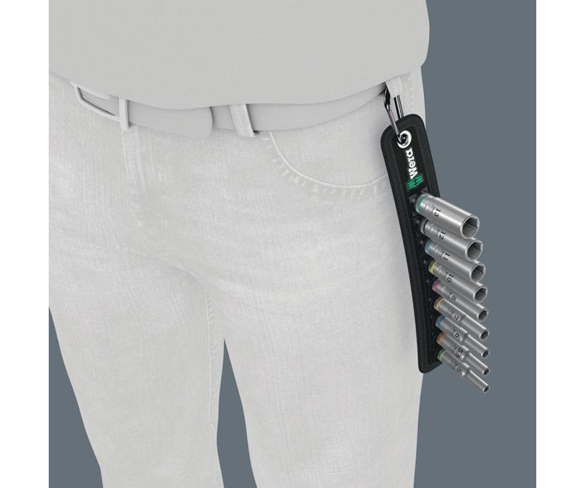 robuster Textilgurt (Belt) im typischen Wera Design mit 9 langen 1/4" Hand- und Maschinensteckschlüssel-Einsätzen (non-impact) auf engstem Raum · leichtgängiger Drehmechanismus sorgt für einen sicheren Halt und leichte Entnahme der Nüsse · inklusive Karabinerhaken zur Befestigung an Gürtelschlaufen oder Taschen · mit Vliesrücken und Klettklebestreifen zur einfachen Befestigung z.B. an Wand, Regal, Werkstattwagen und Wera 2go Werkzeugtransportsystem · lange 1/4" Hand- und Maschinensteckschlüssel-Einsätze (ISO 2725-Teil 3) von Wera für den Einsatz im Hand- und Maschinenbetrieb (non impact) auch bei tiefliegenden Verschraubungen und überstehenden Gewindestangen · mit Take it easy Werkzeugfinder mit Farbkennzeichnung nach Größen - zum einfachen und schnellen Finden des benötigten Werkzeugs · griffig zum leichten Greifen auch mit öligen Händen · mit Sechskantprofil und Kugelfangrille · das Sechskantprofil ermöglicht die Übertragung hoher Kräfte und belastet die Kanten der Schraubenmutter bzw. des Schraubenkopfes weniger als ein Zwölfkantprofil · feinverzahnte Knarren machen darüber hinaus durch ihren kleinen Rückschwenkwinkel den Einsatz eines Zwölfkantprofils auch in beengten Raumverhältnissen überflüssig · für Außensechskantschrauben und -muttern