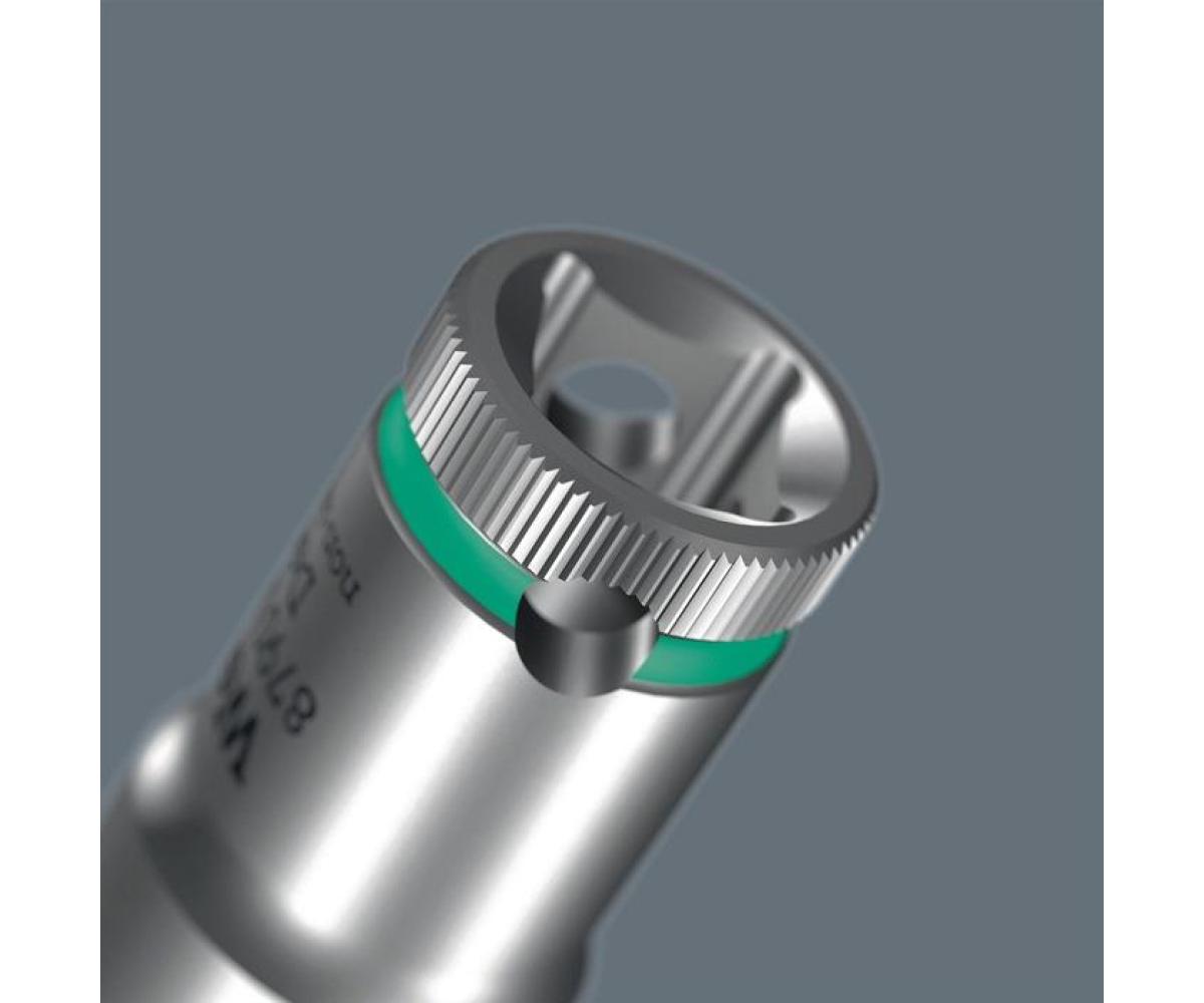 Nuss-Magnetleiste mit 9 langen Hand- und Maschinensteckschlüssel-Einsätzen (non-impact) · 3/8". Ein leichtgängiger Drehmechanismus sorgt für einen sicheren Halt und leichte Entnahme der Nüsse. Lange 3/8" Hand- und Maschinensteckschlüssel-Einsätze (ISO 2725-Teil 3) von Wera für den Einsatz im Hand- und Maschinenbetrieb (non impact) auch bei tiefliegenden Verschraubungen und überstehenden Gewindestangen. Mit Take it easy Werkzeugfinder mit Farbkennzeichnung nach Größen - zum einfachen und schnellen Finden des benötigten Werkzeugs. Griffig zum leichten Greifen auch mit öligen Händen. Mit Sechskantprofil und Kugelfangrille. Das Sechskantprofil ermöglicht die Übertragung hoher Kräfte und belastet die Kanten der Schraubenmutter bzw. des Schraubenkopfes weniger als ein Zwölfkantprofil. Feinverzahnte Knarren machen darüber hinaus durch ihren kleinen Rückschwenkwinkel den Einsatz eines Zwölfkantprofils auch in beengten Raumverhältnissen überflüssig. Für Außensechskantschrauben und -muttern. Die Magnetleiste ermöglicht die temporäre Anbringung an metallischen Oberflächen und verfügt dank der Twist to unlock Funktion über eine sichere Nussverriegelung und -entriegelung.