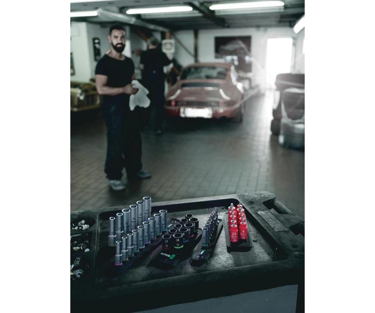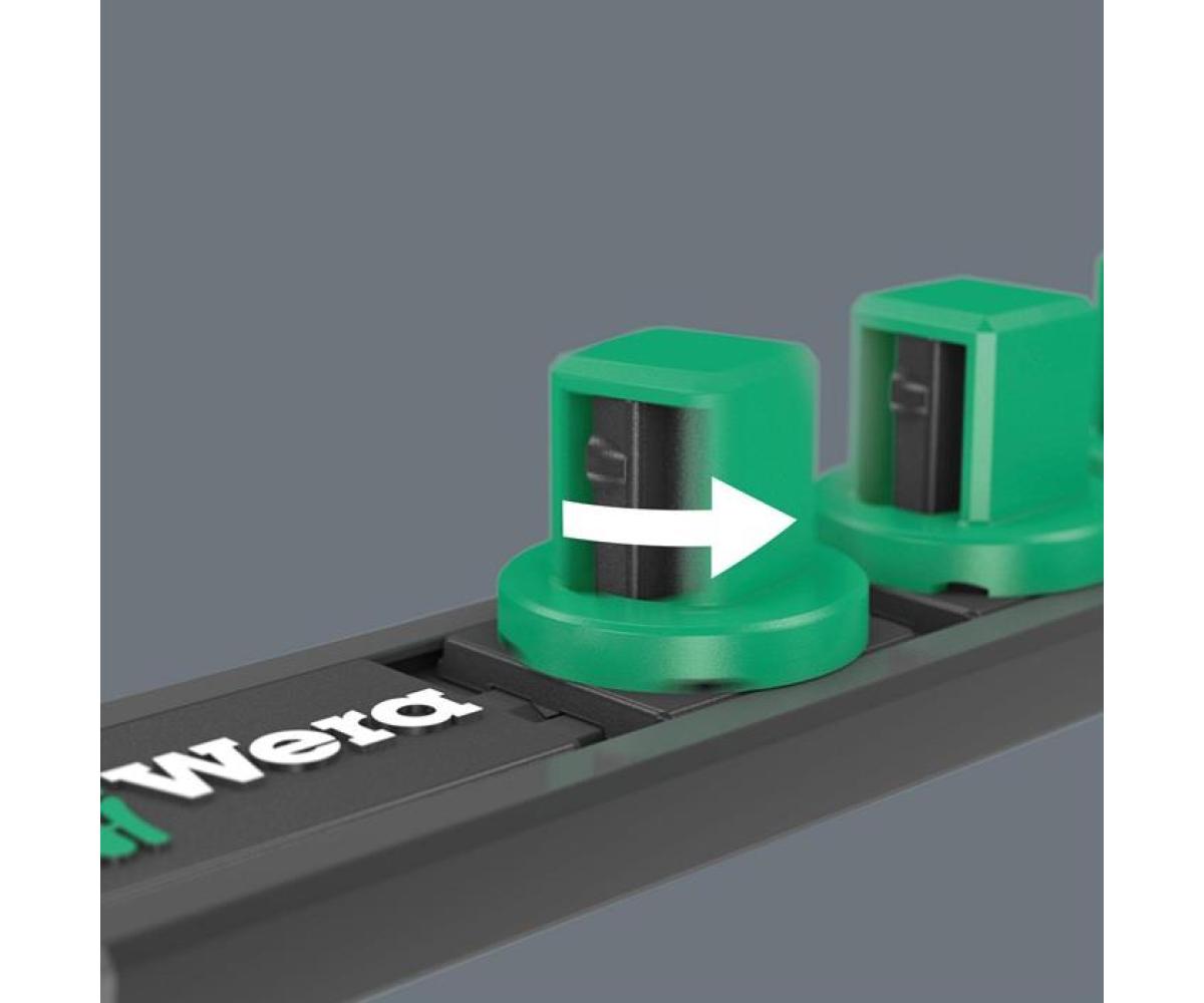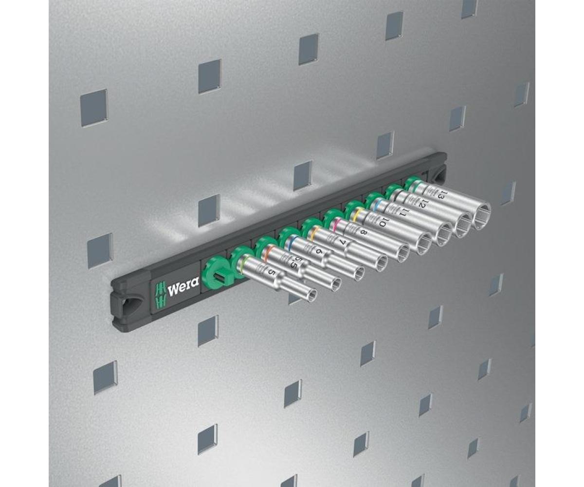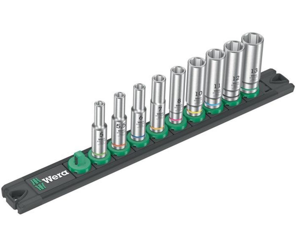 Nuss-Magnetleiste mit 9 langen Hand- und Maschinensteckschlüssel-Einsätzen (non-impact) · 1/4". Ein leichtgängiger Drehmechanismus sorgt für einen sicheren Halt und leichte Entnahme der Nüsse. Lange 1/4" Hand- und Maschinensteckschlüssel-Einsätze (ISO 2725-Teil 3) von Wera für den Einsatz im Hand- und Maschinenbetrieb (non impact) auch bei tiefliegenden Verschraubungen und überstehenden Gewindestangen. Mit Take it easy Werkzeugfinder mit Farbkennzeichnung nach Größen - zum einfachen und schnellen Finden des benötigten Werkzeugs. Griffig zum leichten Greifen auch mit öligen Händen. Mit Sechskantprofil und Kugelfangrille. Das Sechskantprofil ermöglicht die Übertragung hoher Kräfte und belastet die Kanten der Schraubenmutter bzw. des Schraubenkopfes weniger als ein Zwölfkantprofil. Feinverzahnte Knarren machen darüber hinaus durch ihren kleinen Rückschwenkwinkel den Einsatz eines Zwölfkantprofils auch in beengten Raumverhältnissen überflüssig. Für Außensechskantschrauben und -muttern. Die Magnetleiste ermöglicht die temporäre Anbringung an metallischen Oberflächen und verfügt dank der Twist to unlock Funktion über eine sichere Nussverriegelung und -entriegelung.