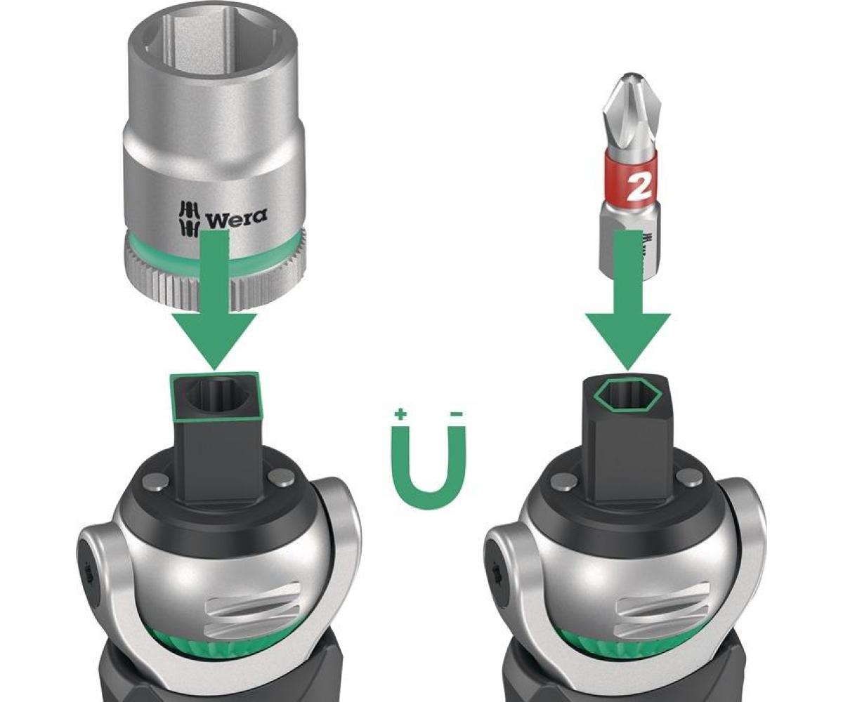 mit Schwenk- und Umschaltknarre 8009 Zyklop · mit Kombiwerkzeugaufnahme geeignet für Steckschlüssel-Einsätze 10,0 mm (3/8")-Vierkantantrieb und Bits mit 6,3 mm (1/4")-Sechskantantrieb (C 6,3 und E 6,3) · mehrkomponentiger Kraftform-Griff - im Griff integriertes, unverlierbares, freischwenkbares Magazin mit 12 Bits · frei schwenkbarer Knarrenkopf (definierte Stellung bei 0°, 15° und 90° nach links und rechts) · in 0°-Stellung einsetzbar wie ein konventioneller Schraubendreher · Links-/Rechtsumschaltung · magnetische Direktaufnahme