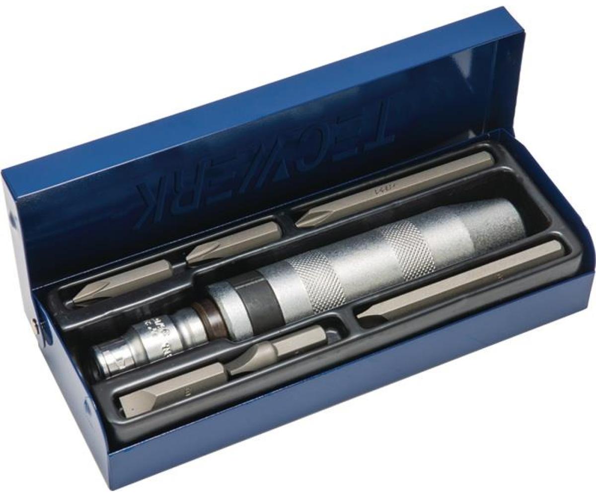 Schlagschrauber · 12,5 mm (1/2")-Vierkantantrieb · (zur Aufnahme von Kraft-Steckschlüssel-Einsätzen 12,5 mm (1/2")-Vierkantantrieb) · besonders geeignet zum Lösen festsitzender Schrauben durch Schlagen mit dem Hammer · mit Rechts- und Linkslauf Inhalt: 1 Schlagschrauber 12,5 mm (1/2")-Vierkantantrieb mit Rechts-/ Linkslauf je 1 Bit für Schlitzschrauben 7,94 mm (5/16") 8 x 36 / 8 x 80 / 10 x 36 mm je 1 Bit für Schrauben mit Kreuzschlitz (PH) 7,94 mm (5/16"), Gr. 2 x 36 / 2 x 80 / 3 x 36 mm 1 Verbindungsstück 12,5 mm (1/2")-Innenvierkant auf 7,94 mm (5/16")-Innensechskant