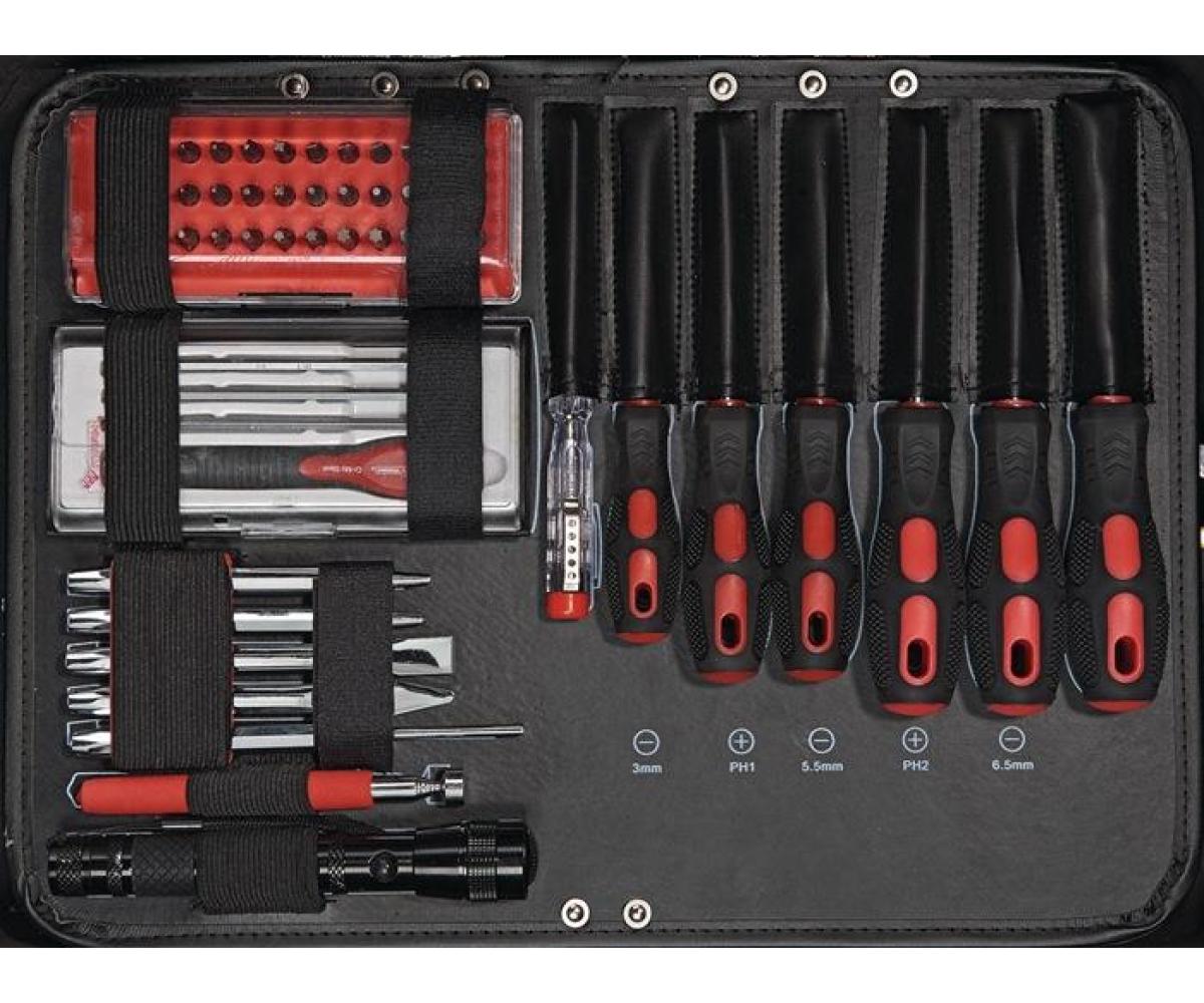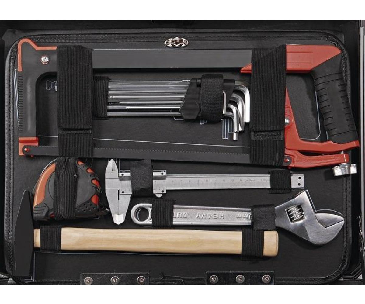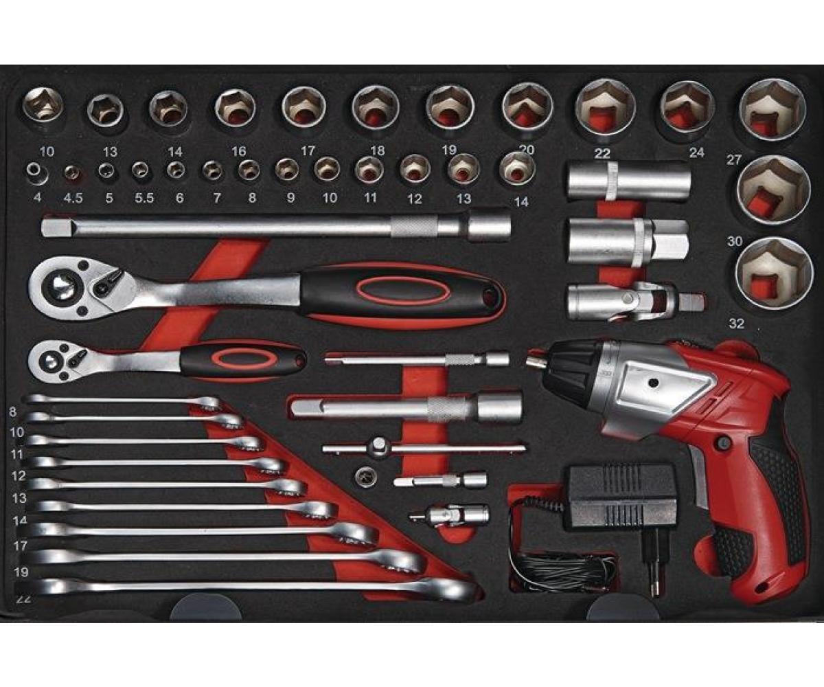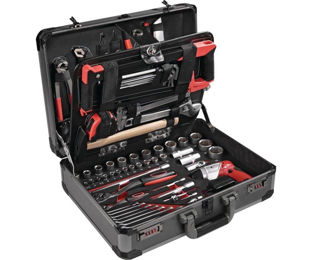 Inhalt: allgemeine Handwerkzeuge 1 St. Kantenzange 250 mm 1 St. Wasserpumpenzange 250 mm 1 St. Kombizange 180 mm, mit 2-Komponenten-Griffe 1 St. Telefonzange 160 mm, mit 2-Komponenten-Griffe 1 St. Seitenschneider 160 mm, mit 2-Komponenten-Griffe 1 St. Universal-Messer 1 St. Universal-Schere, mit 2-Komponenten-Griffe 1 St. Sicherungsringzange, mit 4 auswechselbaren Aufsätzen 1 St. Metallsägebogen mit Blatt (300 mm) je 1 Winkelschraubendreher mit Kugelkopf, 1,5 / 2 / 2,5 / 3 / 4 / 5 / 6 / 8 / 10 mm (im Kunststoffhalter) 1 St. Rollgabelschlüssel 250 mm je 1 St. Gabel-Ringschlüssel SW 8 / 10 / 11 / 12 / 13 / 14 / 17 / 19 / 22 mm 1 St. Schlosserhammer 300 g 1 St. Taschenlampe 140 mm 1 St. Magnetheber Länge 135 - 600 mm 5 tlg. Meißel-Set (Flach- und Spitzmeißel, Körner, Durchschläger, Splintentreiber im Kunststoffhalter) 4 tlg. Schraubendrehersatz mit Wechselklingen, 120 mm, bestehend aus 2-K-Handgriff und 3 Doppelklingen: 1,5 mm x PH 00 / 2,5 mm x PH 0 / 3,0 mm x PH 1 31 tlg. Bits-Box Inhalt: 7 St. Bits für Schlitzschrauben (3 / 4 / 5 / 5,5 / 6 / 7 / 8 mm) 6 St. Bits für Schrauben mit Kreuzschlitz (PH), (Gr. 1 / 2 / 2 / 3 / 3 / 4) 7 St. Bits für Schrauben mit Kreuzschlitz (PZD), (Gr. 1 / 1 / 2 / 2 / 3 / 3 / 4) 5 St. Sechskantbits für Schrauben mit Innensechskant-Profil (3 / 4 / 5 / 6 / 7 mm) 14 St. Bits für Schrauben mit Innen-TORX®-Profil (T 10 / 10 / 15 / 15 / 15 / 20 / 20 / 25 / 25 / 25 / 30 / 30 / 40 / 40) (alle Bits 25 mm lang) 1 St. magnetischer Bithalter 50 mm, mit Schnellwechselfutter 1 St. Spannungsprüfer 145 mm, 120 - 250 Volt AC je 1 St.Schraubendreher für Schlitzschrauben mit 2-K-Griff 3,0 x 0,5 x 75 / 5,5 x 1,0 x 75 / 6,5 x 1,2 x 100 mm je 1 St. Schraubendreher für Schrauben mit Kreuzschlitz mit 2-K-Griff PH 1 x 75 / PH 2 x 100 mm 1 St Bit-Handhalter 6,3 mm (1/4") mit 2-K-Griff, Magnet und Schnellwechselfutter je 1 St. Ring-Maulschlüssel 8 / 10 / 11 / 12 / 13 / 14 / 17 / 19 / 22 mm 1 St. Schieblehre, Messbereich 0 - 150 mm 1 St. Rollbandmaß 5 m Inhalt: mit 1/4"-Vierkantantrieb 1 St. Umschaltknarre 6,3 mm (1/4") 72 Zähne, fein-verzahnt, 2-Komponenten-Heft je 1 St. 6-kant-Steckschlüssel-Einsatz 6,3 mm (1/4")-Vierkantantrieb mit schraubenschonendem Profil und Rändelung, 4 / 4,5 / 5 / 5,5 / 6 / 7 / 8 / 9 / 10 / 11 / 12 / 13 / 14 mm 1 St. Griff mit Gleitstück Länge 110 mm 1 St. Kardangelenk 6,3 mm (1/4") je 1 Verlängerung 6,3 mm (1/4"), 50 / 100 mm lang Inhalt: mit 1/2"-Vierkantantrieb 1 St. Umschaltknarre 12,5 mm (1/2") 72 Zähne, fein-verzahnt, 2-Komponenten-Heft je 1 St. Steckschlüssel-Einsatz 12,5 mm (1/2")-Vierkantantrieb, mit schraubenschonendem Profil und Rändelung 10 / 13 / 14 / 16 / 17 / 18 / 19 / 20 / 22 / 24 / 27 / 30 / 32 mm je 1 St. Steckschlüsseleinsatz für Zündkerzen, 16 / 21 mm je 1 St. Verlängerung 12,5 mm (1/2"), 125 / 250 mm 1 St. Kardangelenk 12,5 mm (1/2"), 75 mm 1 St. Gleitstück 12,5 mm (1/2") 1 St. Adapter 6,3 mm (1/4") Außenvierkant auf 6,3 mm (1/4") Außensechskant, 30 mm lang 1 St. Adapter 6,3 mm (1/4") Innenvierkant auf 6,3 mm (1/4") Innensechskant, 25 mm lang 1 Akkuschrauber mit Lithium Akku 3,6 Volt/1300 mAh, direkte Bitaufnahme 6,3 mm (1/4") (max. Drehmoment 3 Nm) und integierte LED Leuchte 1 St. SteckerladegerätTechnische Daten