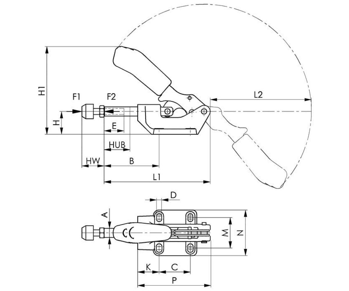 Weitere technische Eigenschaften · C: 41mm · D: 8,5mm · L1: 174mm · F1: 10kN · Gesamthöhe: 134mm · P: 121mm · K: 45mm · A: 16mm · M max.: 50mm · M min.: 41mm · H1: 137,5mm · B max.: 98mm · Bohrungs-Ø: 8,5 mm · F2: 10kN · B min.: 58mm · Eigenschaft: schwer, Druck-/Zugspanner · E: 50mm · H: 38mm · N: 71mm · Gesamtlänge: 172mm · Schubstangenspanner · Nr.6842 Gr.5 · schwer,Druck-/Zugspanner ·
