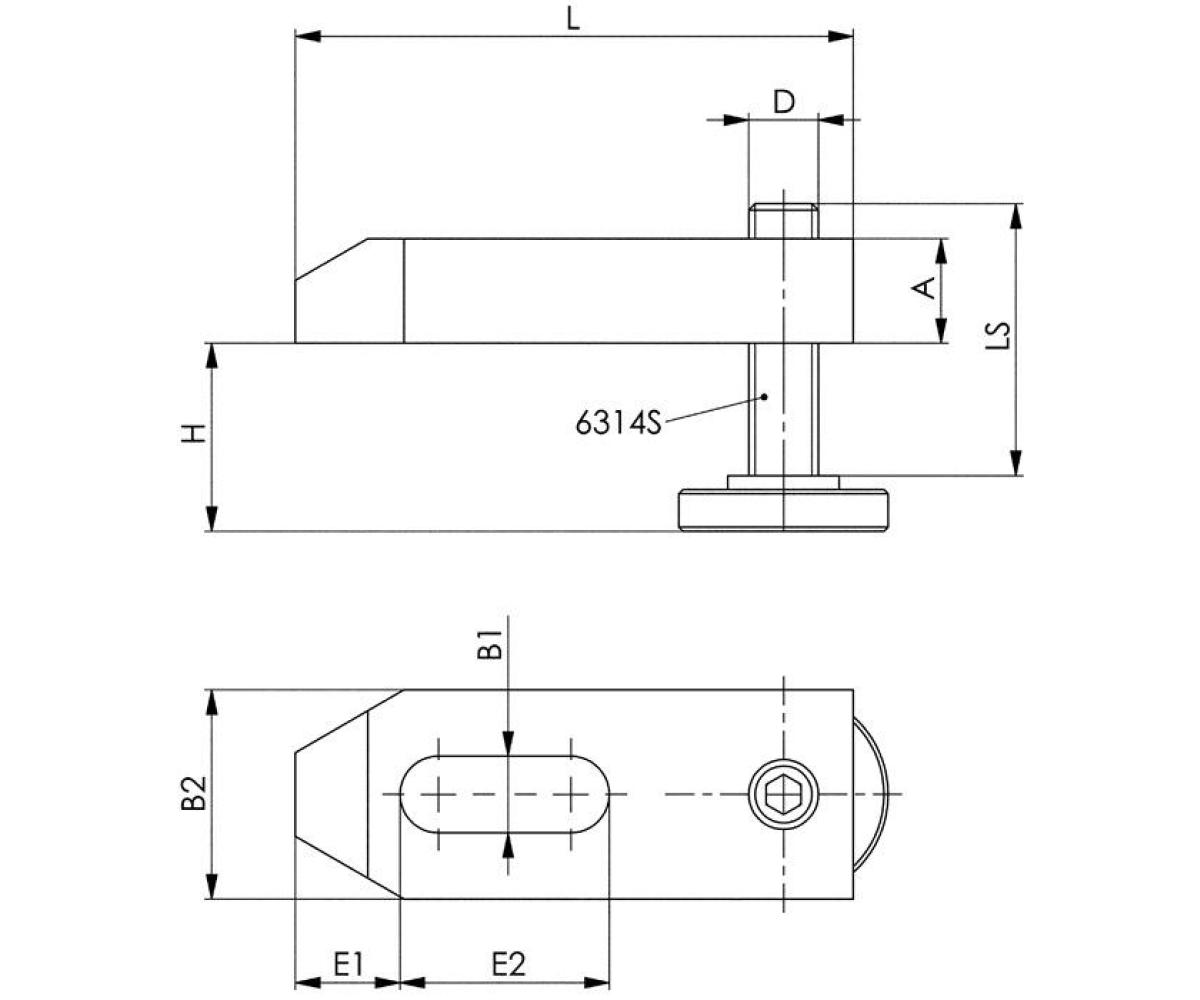 Weitere technische Eigenschaften · Breite: 60 mm · Länge: 160 mm · A: 30mm · B1: 22mm · B2: 60mm · E2: 60mm · D: M20 · E1: 30mm · Gewicht: 2600g · L: 160mm · Stärke: 30 mm · LS: 69mm · Schlitzbreite: 22 mm · H: 16 - 65mm · Spanneisen Nr.6314V · f.T-Nut 20mm · Spann-H.16-65mm · M20x20x160mm AMF ·
