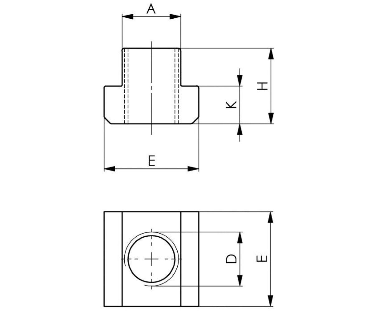 Weitere technische Eigenschaften · A: 21,7mm · D: M16 · K: 14mm · E: 35mm · H: 28mm · T-Nutenstein (DIN 508) · Werksnorm T-Nut 22mm M16 · AMF ·