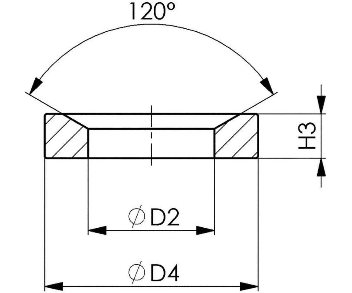 Weitere technische Eigenschaften · D4: 36mm · D2: 23,2mm · Kegelwinkel: 120° · Schraubenkraft max.: 117kN · H3: 7,5mm · Kegelpfanne DIN 6319D · f.Schrauben M20 · Bohrungs-D.23,2mm ·