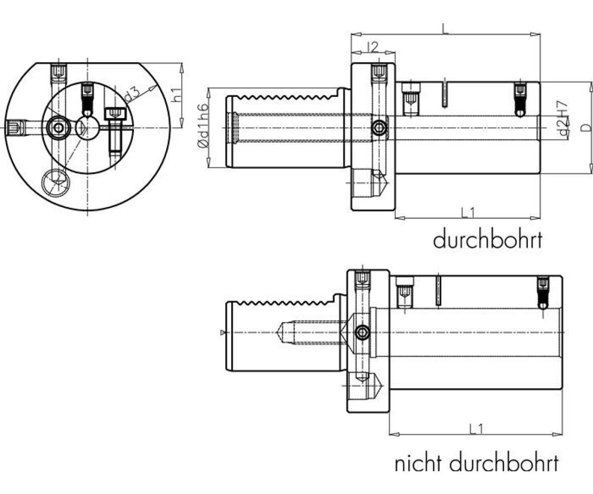 für Bohrstangen · geschlitze Ausführung · Form E2 S · reduziert bzw. verhindert Vibrationen durch Umschlingung der Bohrstange · auch geeignet für vollrunde Bohrstangen mit V-Nut · Halter sind soweit möglich im Schaft durchbohrt · gesichert gegen Herausfallen in den Revolver durch Sicherungsring · geschlitzer Bereich bis 16 mm 4 x D, 20 und 25 mm 3 x D, ab 32 mm 2,5 x D · externe und interne Kühlung möglich · Längeneinstellung bei durchbohrtem Schaft von der Schaftseite möglich