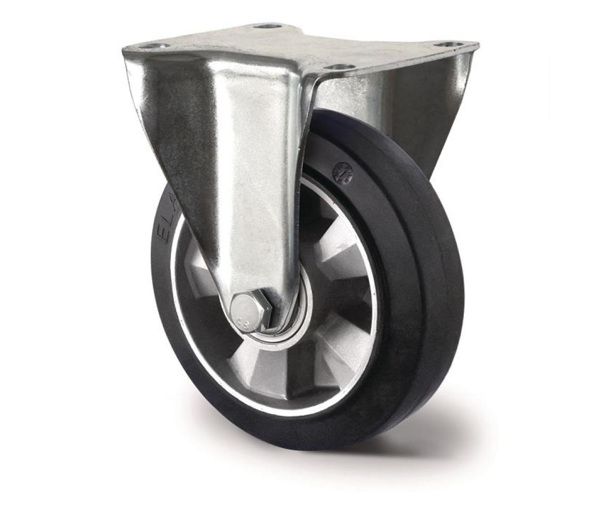 stabiles Stahlblechgehäuse, verzinkt chromatiert · Bockrolle · Elastik-Vollgummireifen (schwarz, fest aufvulkanisiert) auf Aluminium-Radkörper · Radachse verschraubt · Kugellager · mit Plattenbefestigung