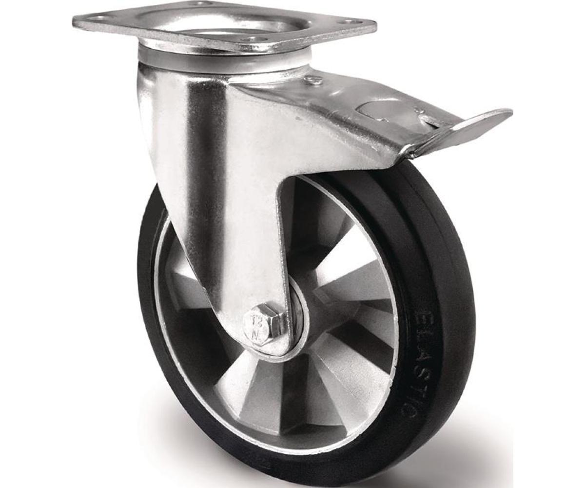 mit Totalfeststeller · stabiles Stahlblechgehäuse, verzinkt chromatiert · zweireihiger Kugelkranz im Gabelkopf · Elastik-Vollgummireifen (schwarz, fest aufvulkanisiert) auf Aluminium-Radkörper · Radachse verschraubt · Kugellager · mit Plattenbefestigung