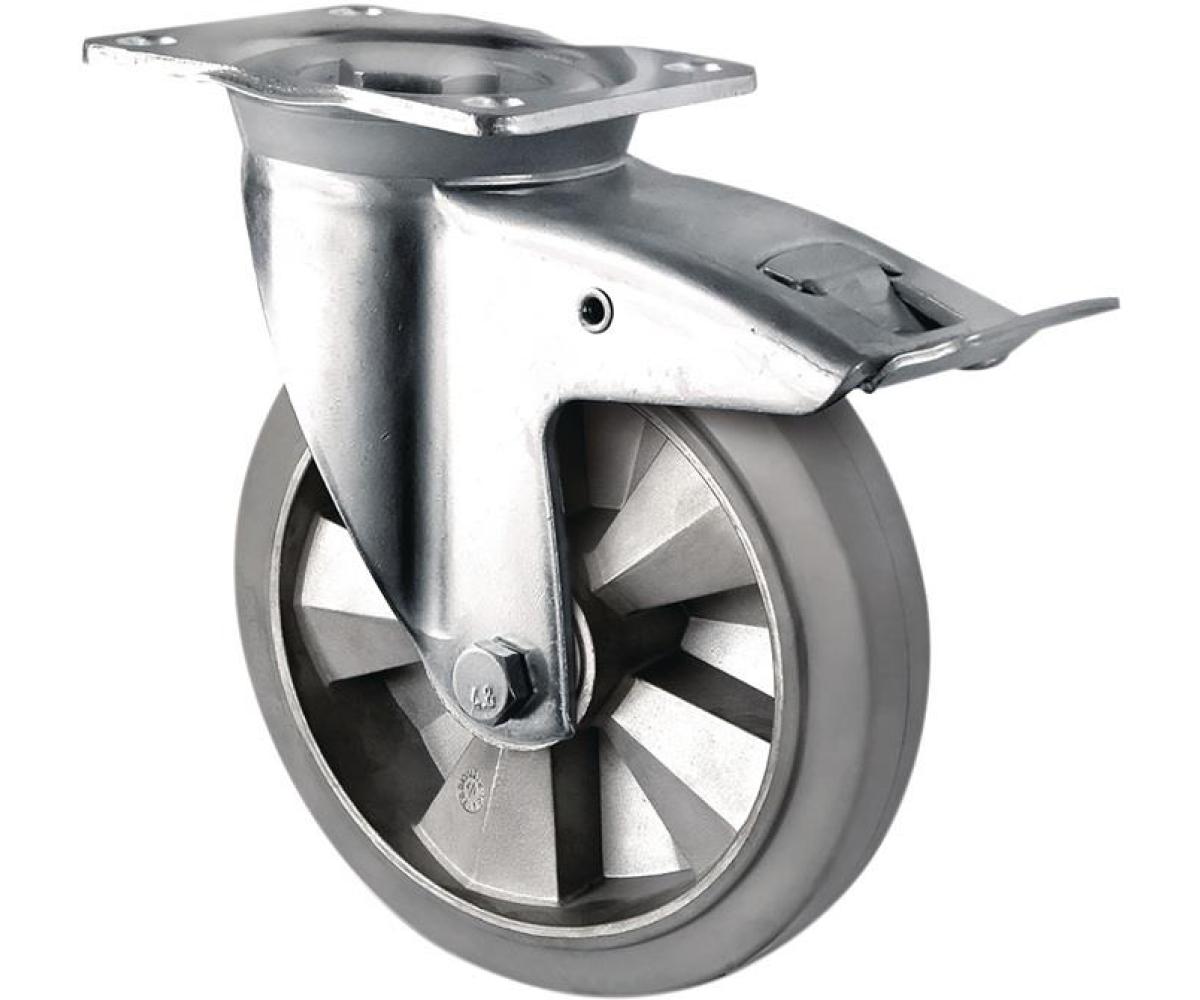 mit Totalfeststeller · stabiles Stahlblechgehäuse, verzinkt chromatiert · zweireihiger Kugelkranz im Gabelkopf · Elastik-Vollgummireifen (grau, fest aufvulkanisiert) auf Aluminium-Radkörper · Radachse verschraubt · Kugellager · mit Plattenbefestigung