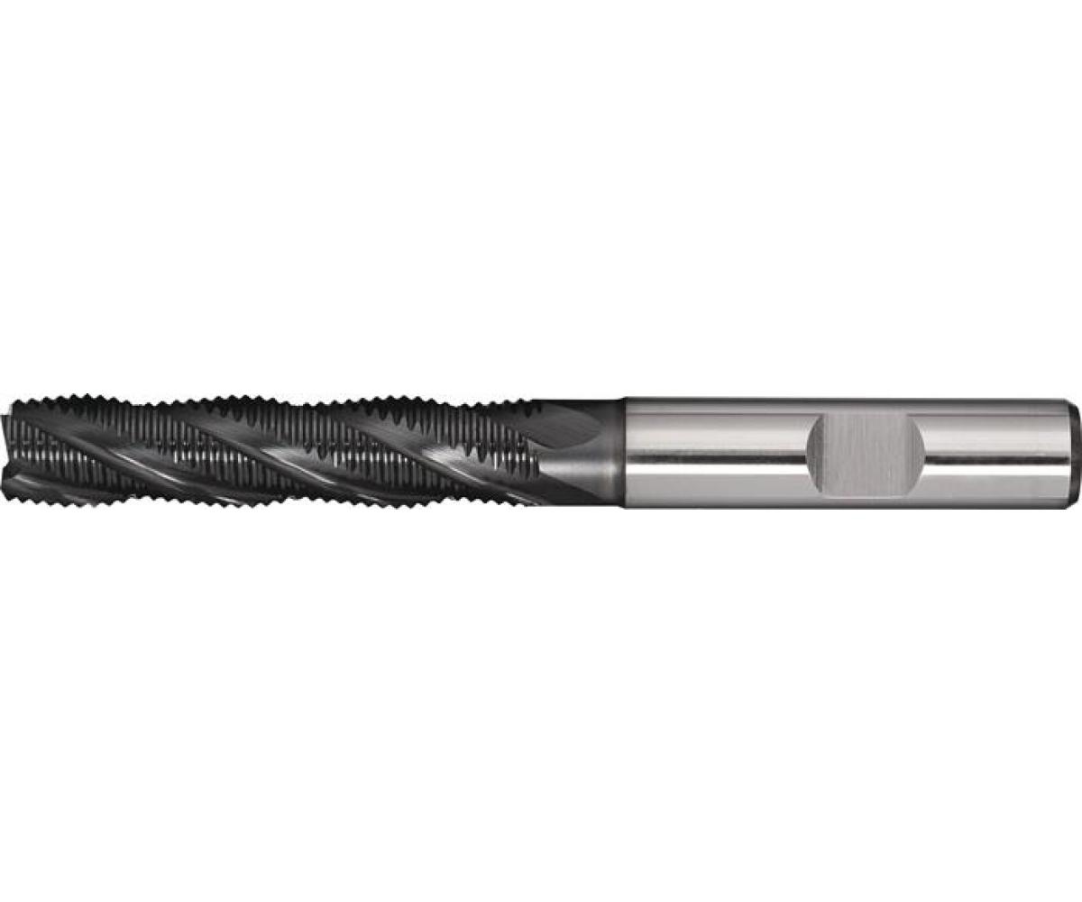 HSS-Co PM · ALCRONA-beschichtet · DIN 844 · Typ HR · Vierschneider · lang · 45° Schutzfase · Zentrumschnitt · Zylinderschaft mit Mitnahmefläche · rechtsschneidend · zum Fräsen von Werkstoffen bis ca. 1400 N/mm² Festigkeit · verbesserte Werkzeugsteifigkeit durch konischen Spannutengrund