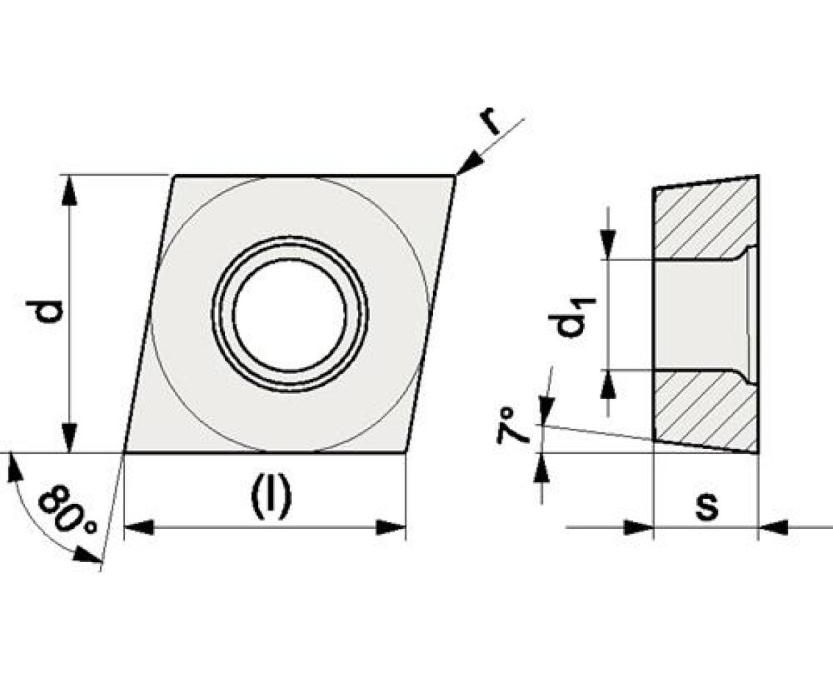 Weitere technische Eigenschaften · d1: 2,8mm · s: 2,38mm · l: 6,4mm · d: 6,35mm · r: 0,2mm · Anwendungsbereich: Bearbeitung Aluminium · Schnitttiefe max.: - mm in Stahl / - mm in Rostfrei / - mm in Guss / 3 mm in NE-Metalle / - mm in Superlegierungen / - mm in gehärtete Stähle · Schnitttiefe min.: - mm in Stahl / - mm in Rostfrei / - mm in Guss / 0,3 mm in NE-Metalle / - mm in Superlegierungen / - mm in gehärtete Stähle · Vorschub min.: - mm/U in Stahl / - mm/U in Rostfrei / - mm/U in Guss / 0,06 mm/U in NE-Metalle / - mm/U in Superlegierungen / - mm/U in gehärtete Stähle · Vorschub max.: - mm/U in Stahl / - mm/U in Rostfrei / - mm/U in Guss / 0,15 mm/U in NE-Metalle / - mm/U in Superlegierungen / - mm/U in gehärtete Stähle · Vc min.: - m/min in Stahl / - m/min in Rostfrei / - m/min in Guss / 170 m/min in NE-Metalle / - m/min in Superlegierungen / - m/min in gehärtete Stähle · Vc max.: - m/min in Stahl / - m/min in Rostfrei / - m/min in Guss / 715 m/min in NE-Metalle / - m/min in Superlegierungen / - m/min in gehärtete Stähle · Wendeschneidplatte CCGT · 060202-AL N20 · Bearb.Alu.PROMAT ·