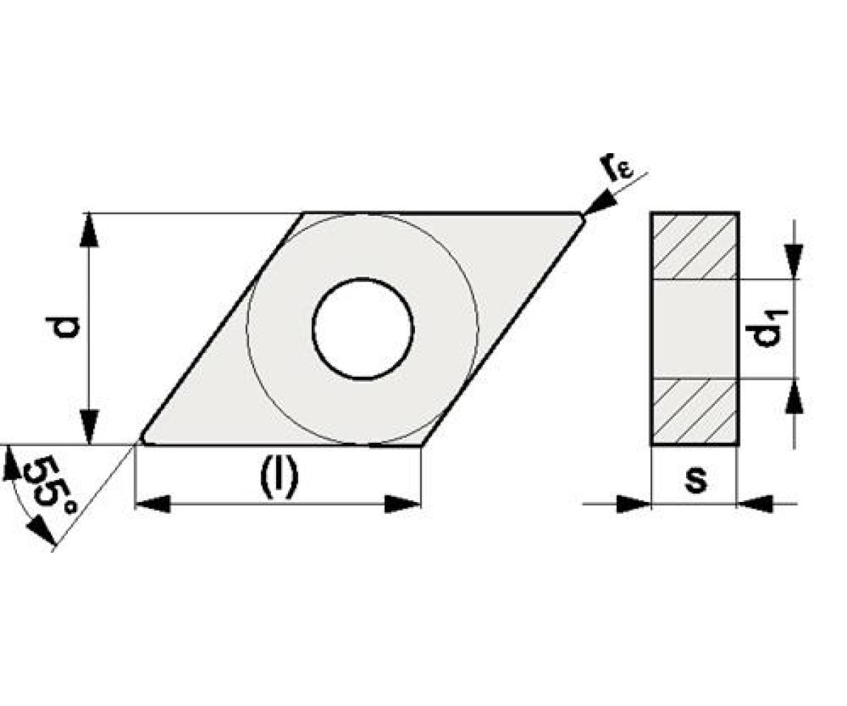 Weitere technische Eigenschaften · d1: 3,81mm · s: 4,76mm · l: 11,6mm · d: 9,53mm · r: 0,4mm · Anwendungsbereich: Bearbeitung Schlicht · Schnitttiefe max.: 3 mm in Stahl / 2,3 mm in Rostfrei / 3 mm in Guss / - mm in NE-Metalle / 1,8 mm in Superlegierungen / - mm in gehärtete Stähle · Schnitttiefe min.: 0,4 mm in Stahl / 0,4 mm in Rostfrei / 0,4 mm in Guss / - mm in NE-Metalle / 0,4 mm in Superlegierungen / - mm in gehärtete Stähle · Vorschub min.: 0,15 mm/U in Stahl / 0,15 mm/U in Rostfrei / 0,15 mm/U in Guss / - mm/U in NE-Metalle / 0,15 mm/U in Superlegierungen / - mm/U in gehärtete Stähle · Vorschub max.: 0,24 mm/U in Stahl / 0,18 mm/U in Rostfrei / 0,24 mm/U in Guss / - mm/U in NE-Metalle / 0,18 mm/U in Superlegierungen / - mm/U in gehärtete Stähle · Vc min.: 170 m/min in Stahl / 100 m/min in Rostfrei / 160 m/min in Guss / - m/min in NE-Metalle / 30 m/min in Superlegierungen / - m/min in gehärtete Stähle · Vc max.: 225 m/min in Stahl / 135 m/min in Rostfrei / 210 m/min in Guss / - m/min in NE-Metalle / 65 m/min in Superlegierungen / - m/min in gehärtete Stähle · Wendeschneidplatte DNMG · 110404-F PMK30 · Bearb.Schlicht PROMAT ·